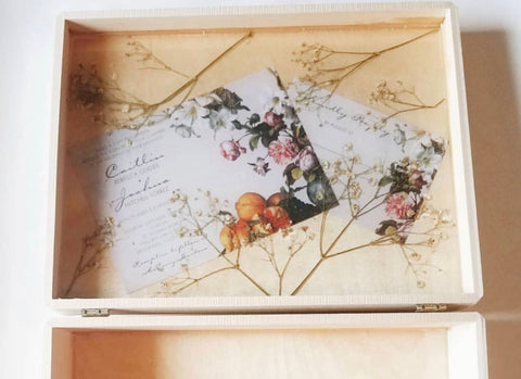 Keepsake boxes are a wonderful way to capture those special, treasured moments for a lifetime. Caitlin created a keepsake box from her wedding day. Using the flowers from her bridal bouquet, even though the flowers have been saved for 3 years, she was able to reconstruct them with the petals she pressed. The interior is made from Caitlin's wedding invitations and pressed baby's breath from the guest tables. It is ready to be filled with loving cards and sentimental gifts from their wedding day.