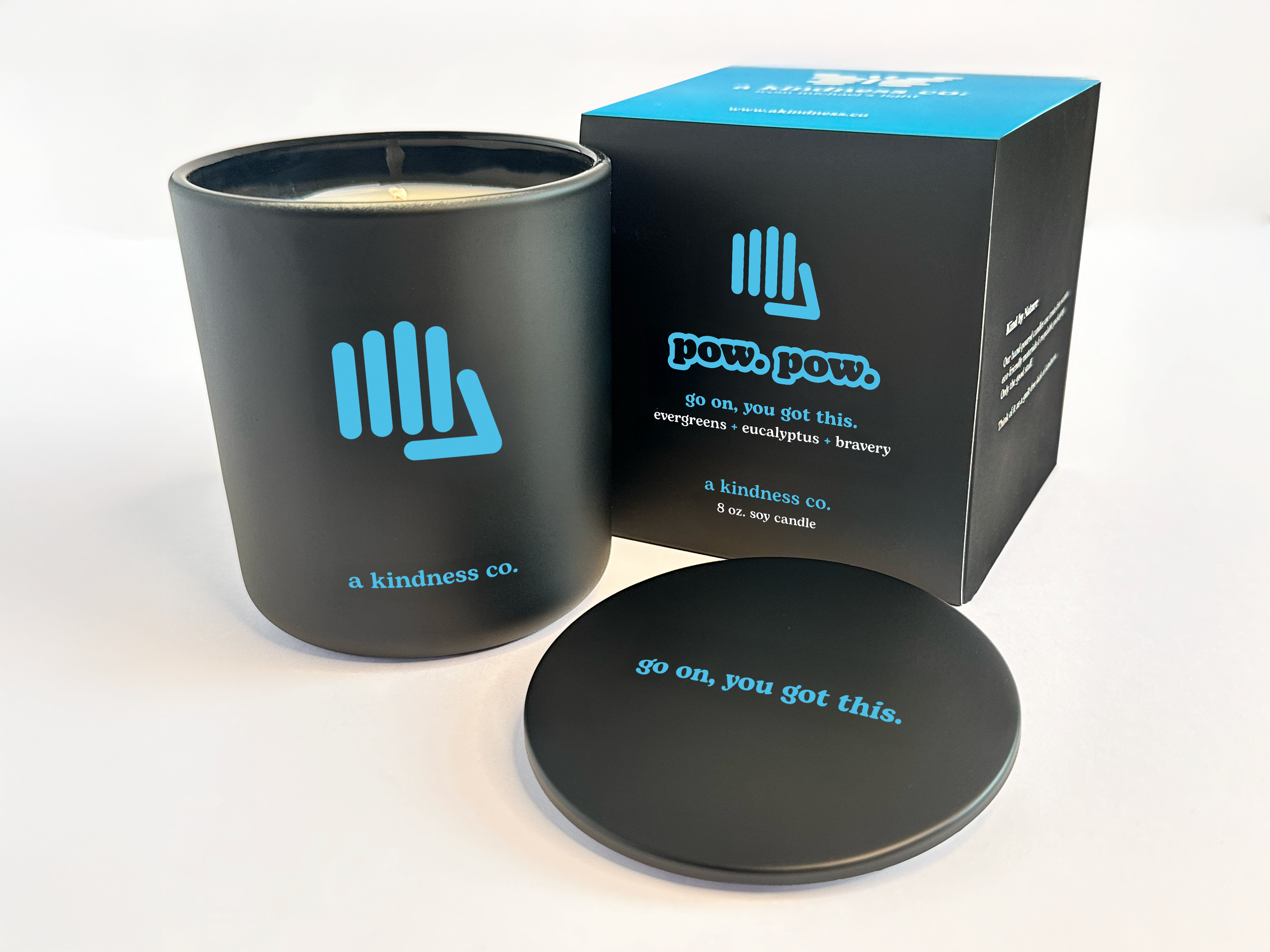 A Kindness Co.’s pow. pow. hand-poured, scented soy candle awakens your senses like a crisp, cool day. Scents of evergreens and eucalyptus are mixed with bravery to propel onward. So, go on. Send it now. It's gonna be a good day. Fragrance Notes: evergreens + eucalyptus + bravery Wax Fill: 8 oz Candle Dimensions: 2.98 in (w) x 3.53 in (h) Burn Time: Up to 50 hours with care Includes: Candle, lid and box