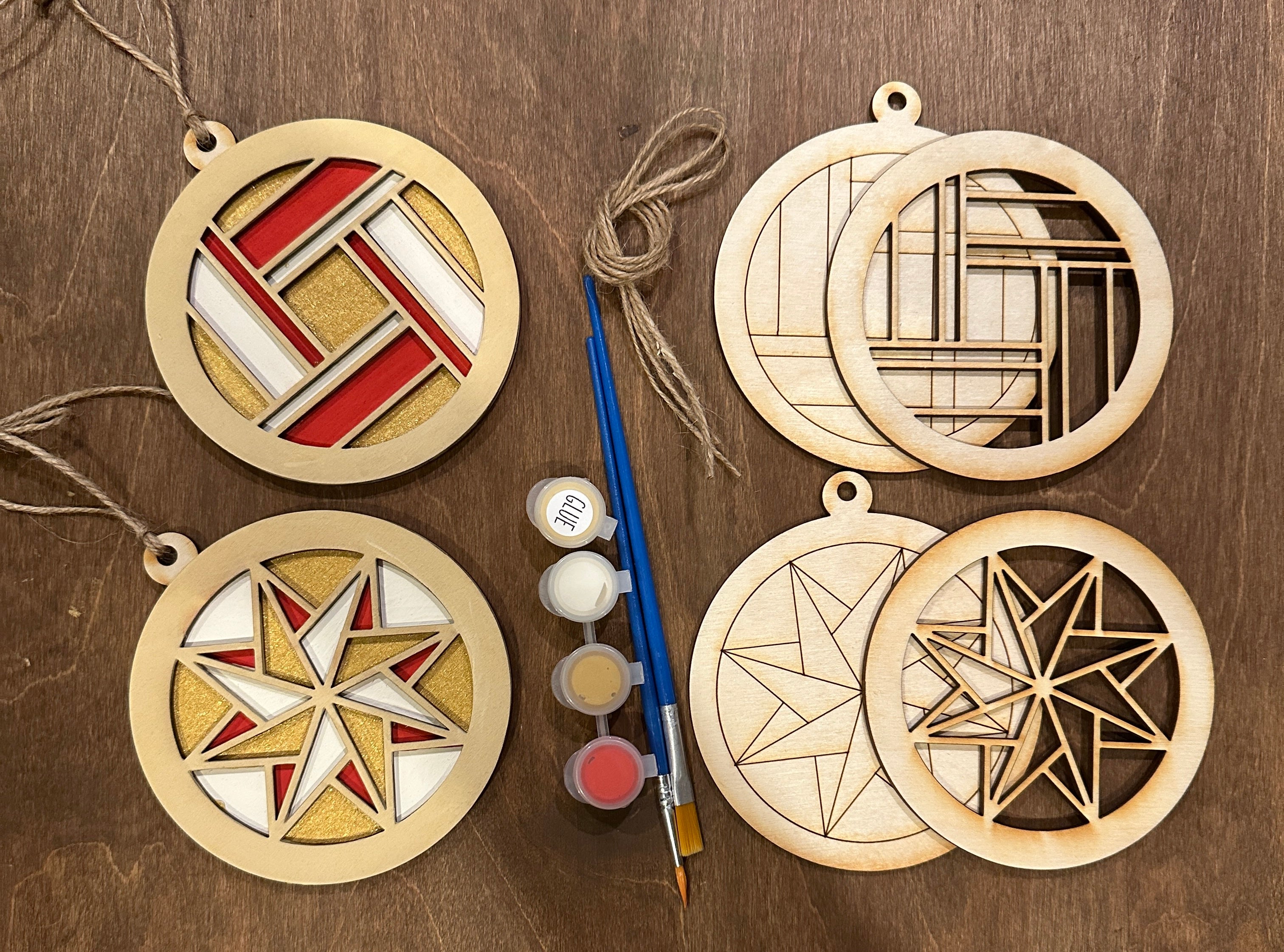 2 4" ornaments (12 possible patterns) - with scoring on base and laser cut overlay, paints, glue, paintbrushes, twine, and directions in a gift box