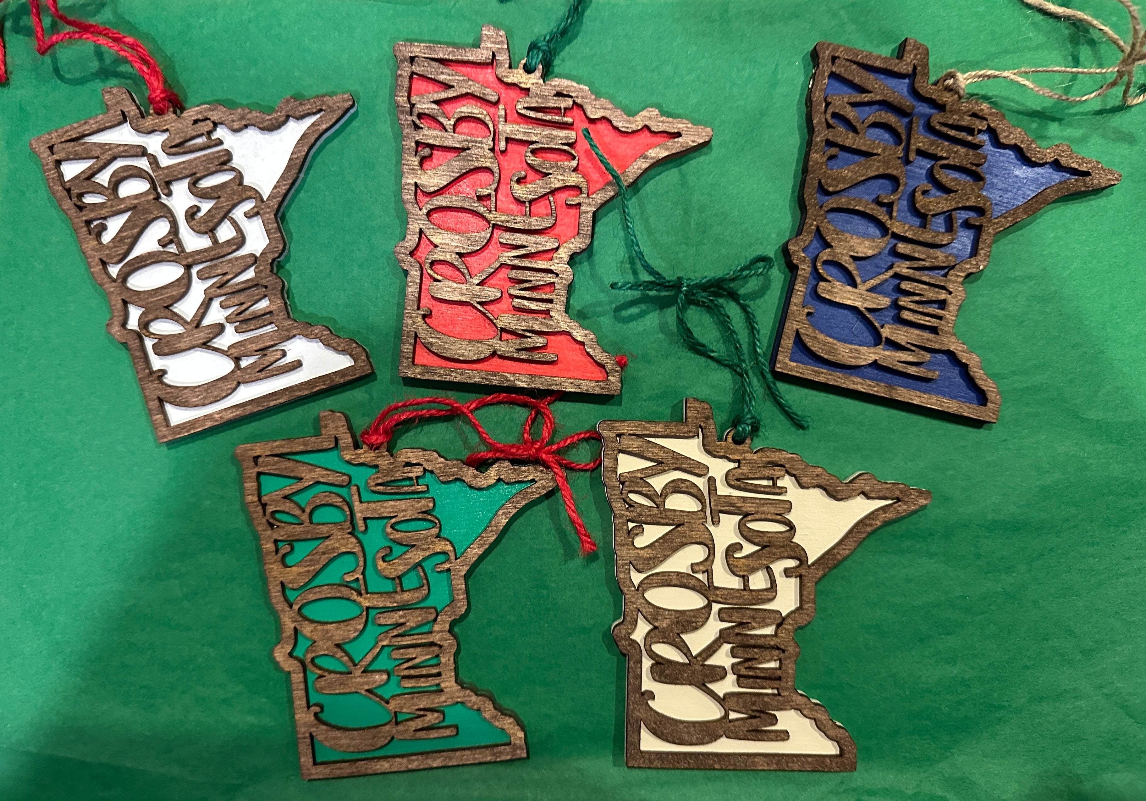 4.4"x4" Crosby Minnesota Ornament- painted base/stained words
