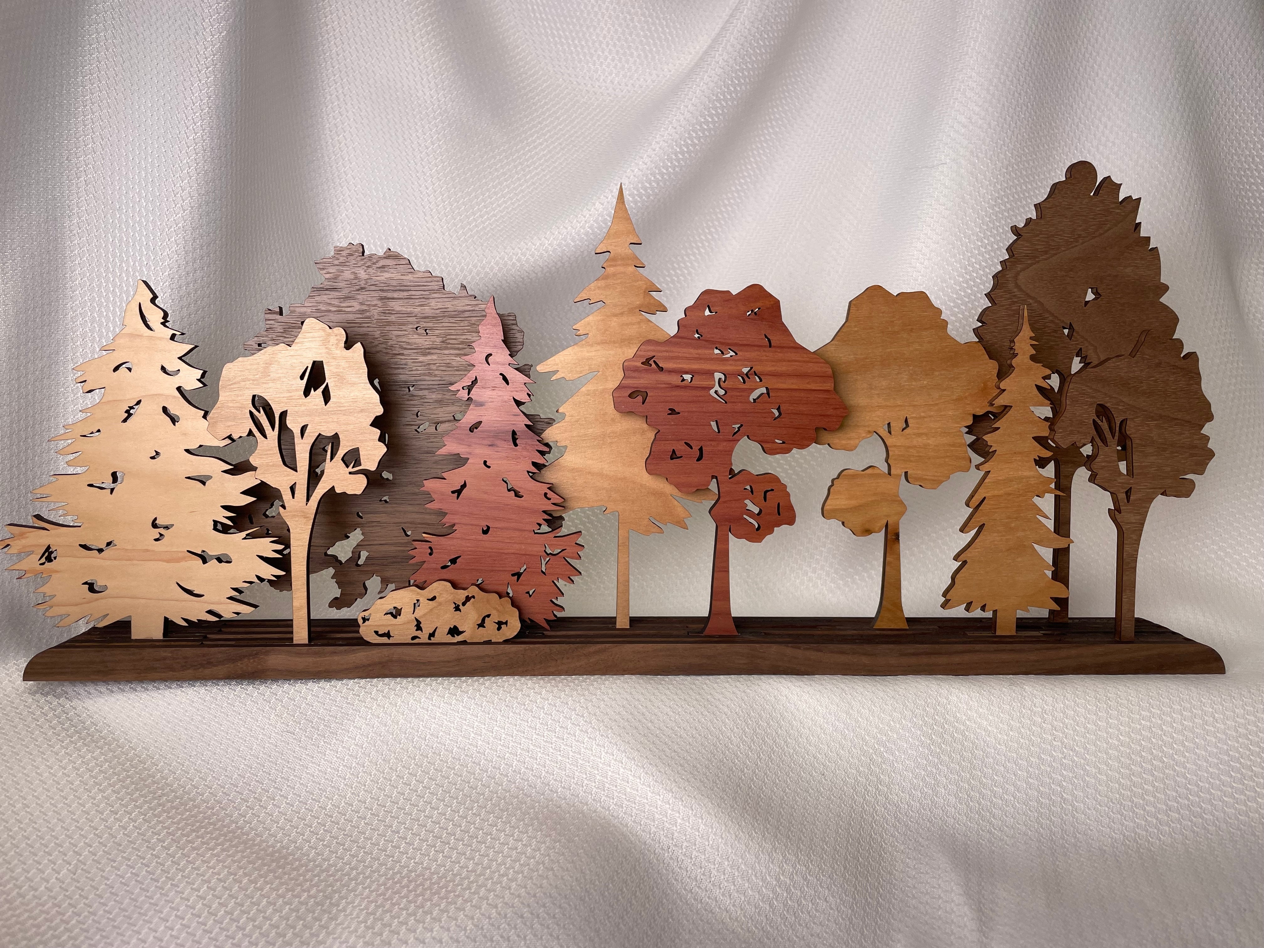 Layers of natural woods, such as walnut, cedar, maple, cherry, hickory, and mahogany, create a dense wooded scene. Ten characters are included to individualize your forest. They come in a muslin bag and consist of: 2 hikers, 2 deer, 2 wolves, 1 bear, 1 moose, 1 fox, and 1 Bigfoot. The forest measures approximately 18 inches long, 3 inches deep, and 12 inches tall, and it comes in a gift-worthy box.