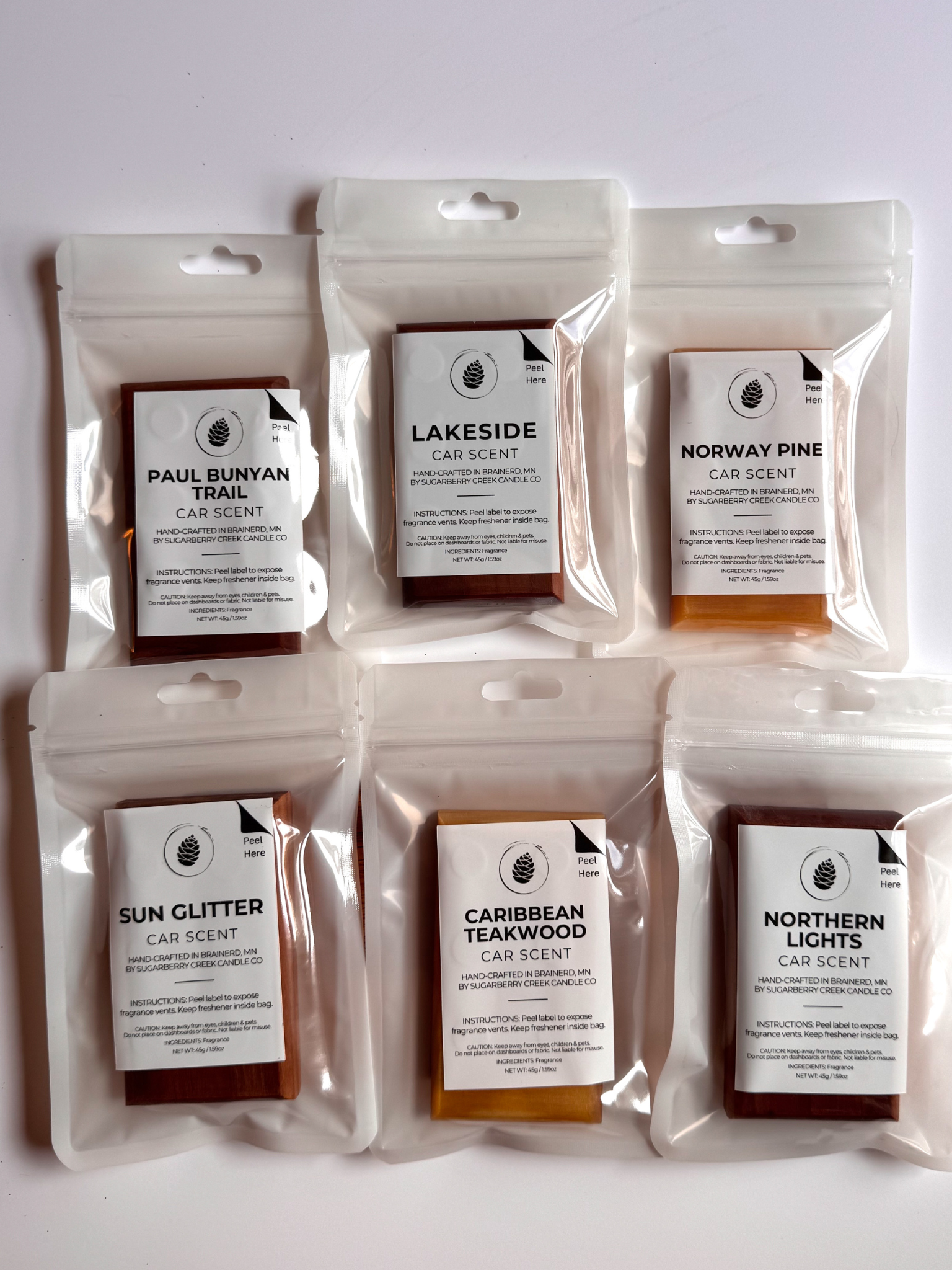 Our wood car freshener stays in the bag and rests neatly on your floorboard. Peel the label to release your favorite candle scent and enjoy the ride.