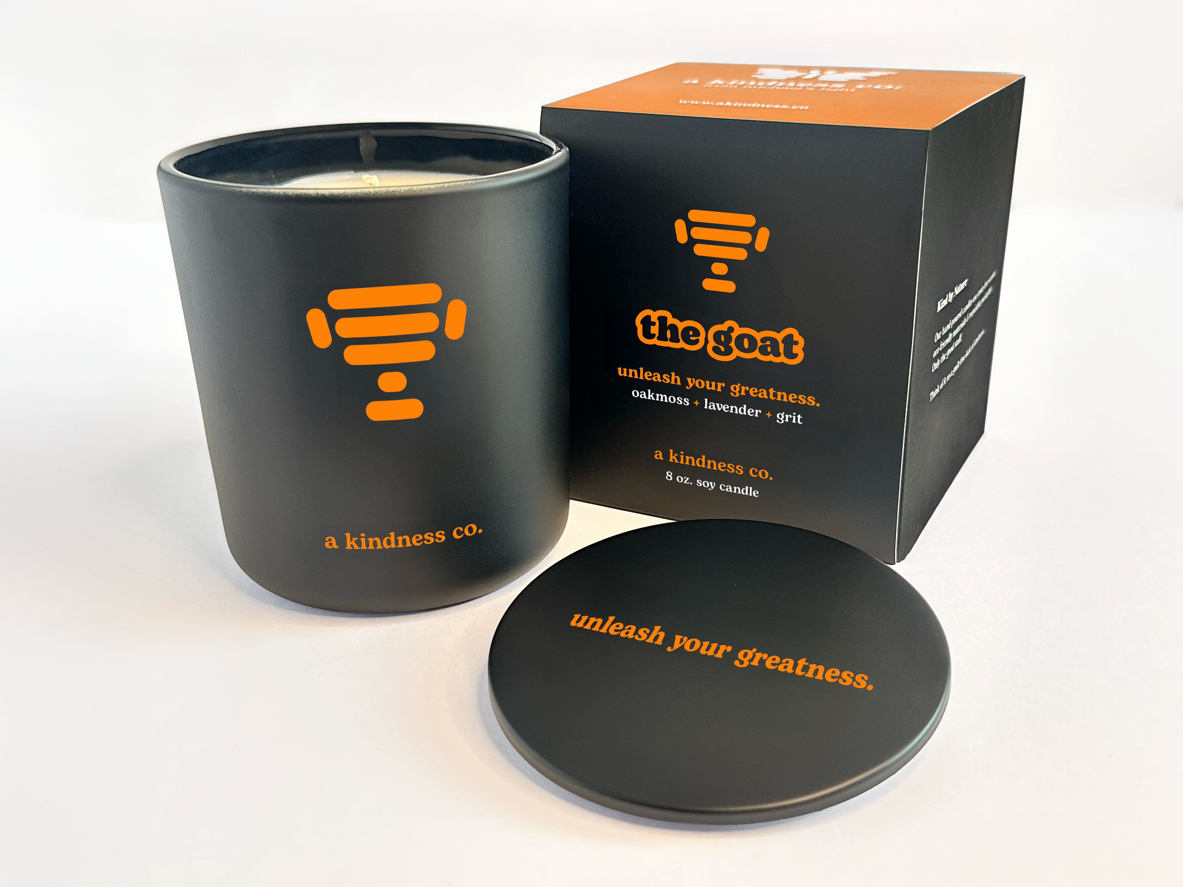 The goat soy candle from A Kindness Co. is universally loved and scented with oakmoss, lavender, and a touch of grit. It's not about luck. You've worked hard and it's all inside you. You are the greatest of all time. Fragrance Notes: Oakmoss + Lavender + Grit Wax Fill: 8 oz. Candle Dimensions: 2.98 in (w) x 3.53 in (h) Burn Time: Up to 50 hours with care Includes: Candle, lid and box