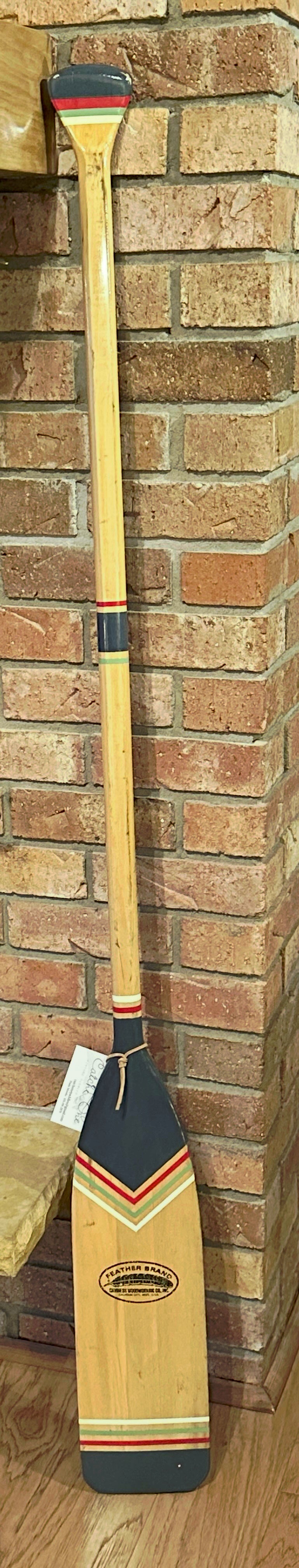 58 inch Vintage Feather Brand paddle. Painted in chevron stripe design in navy, red, green and vanilla.