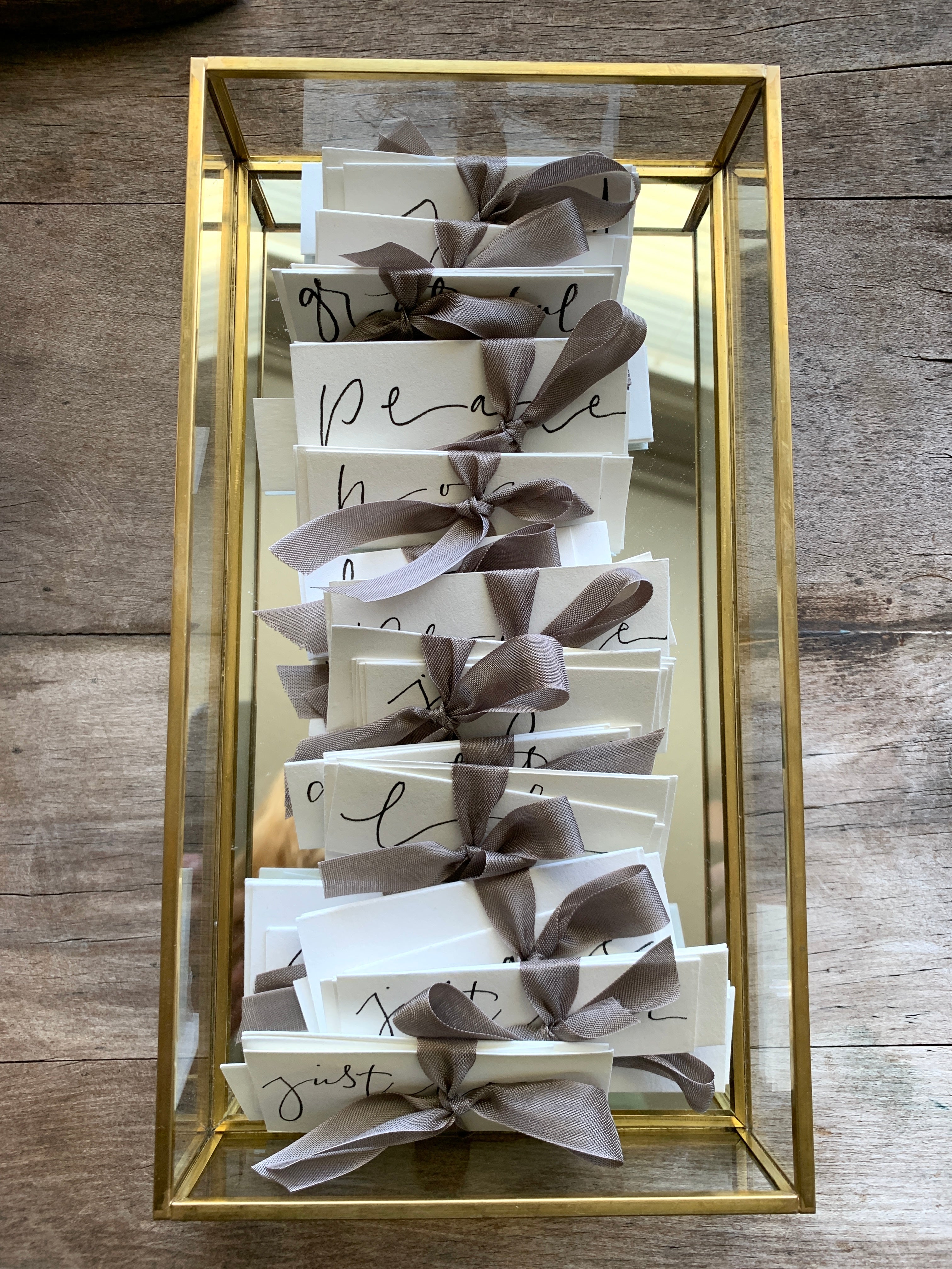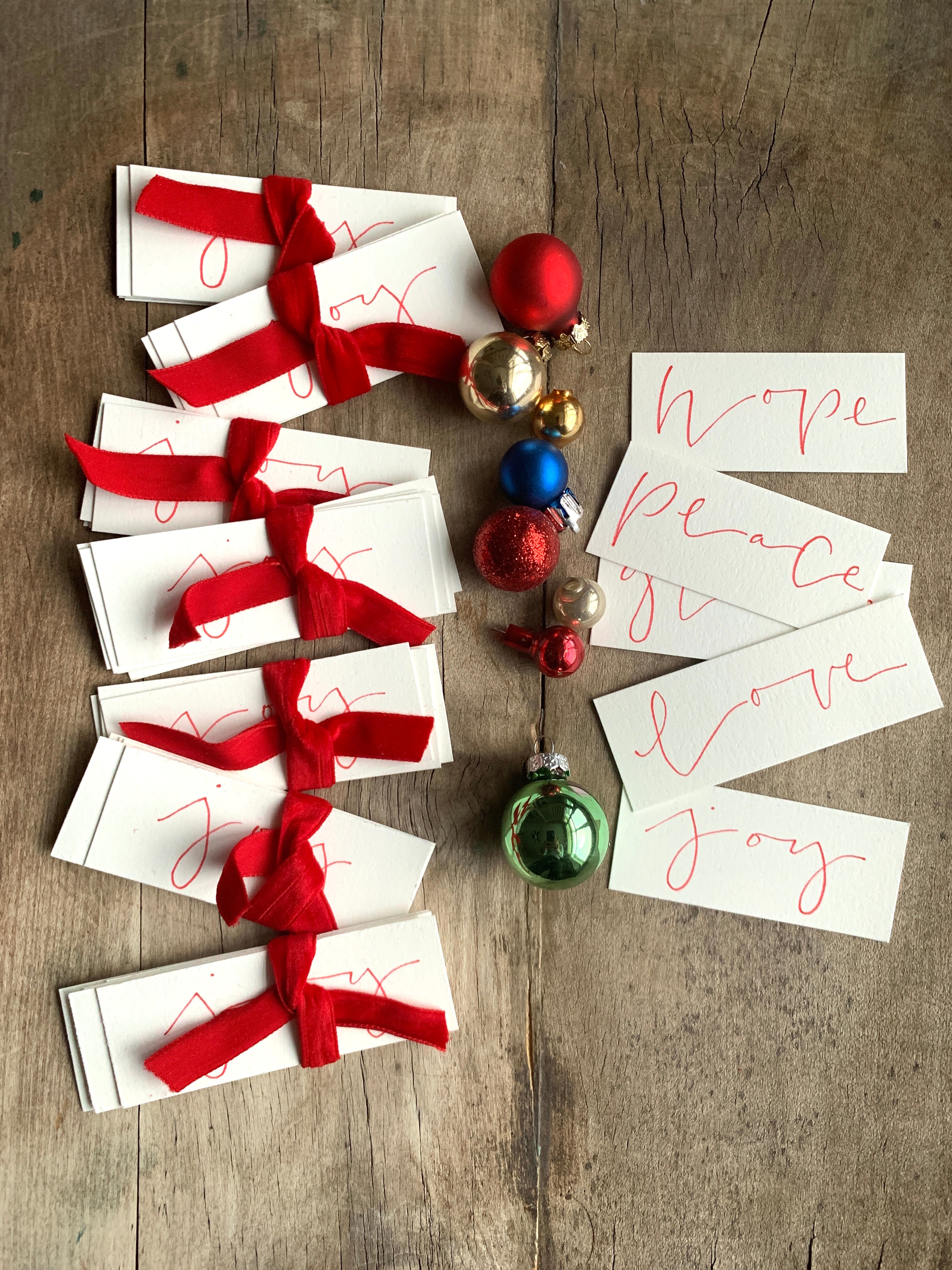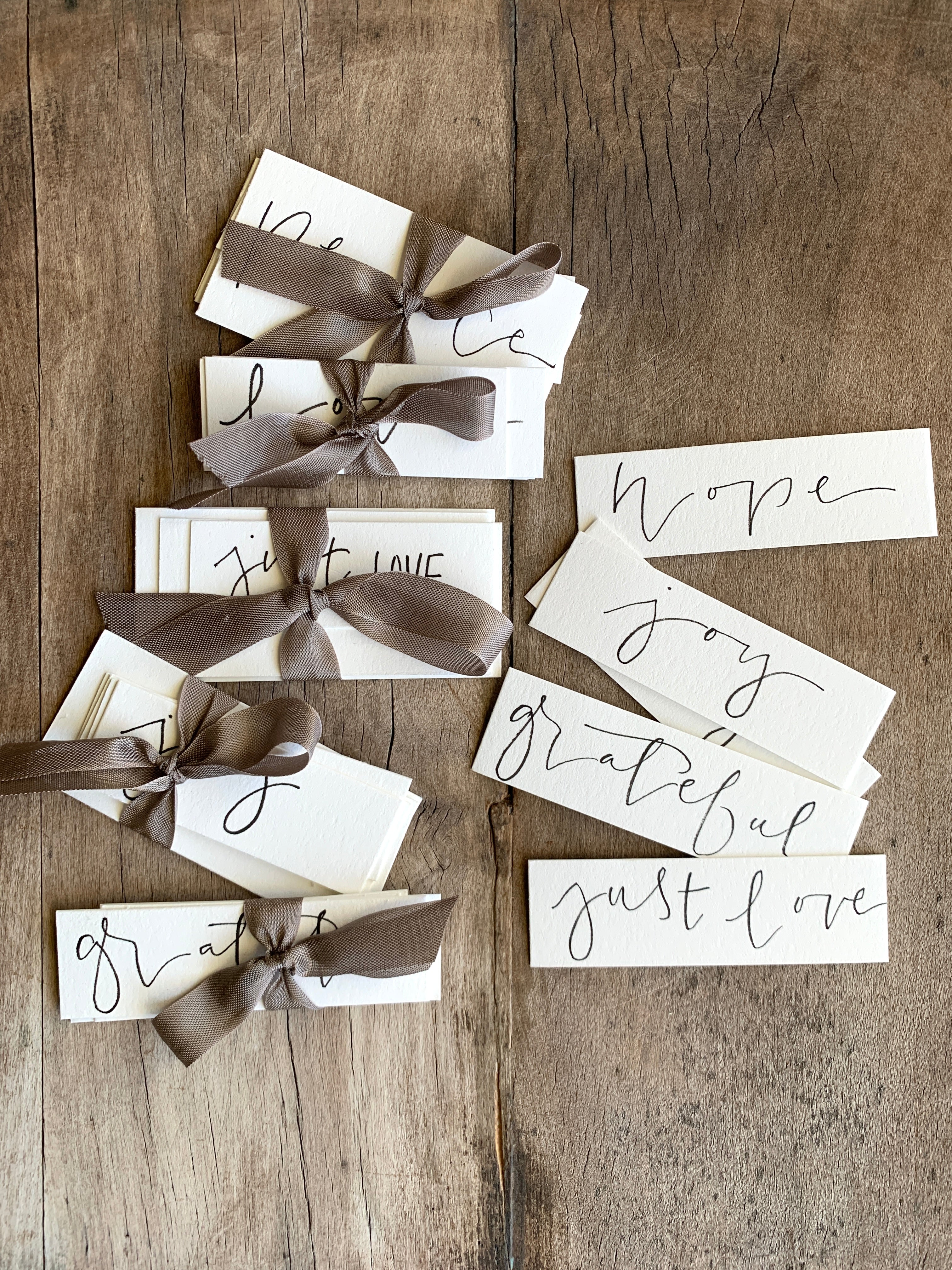 Hand-lettered word bundles tied with silk ribbon. Grace, joy, peace, hope, grateful.