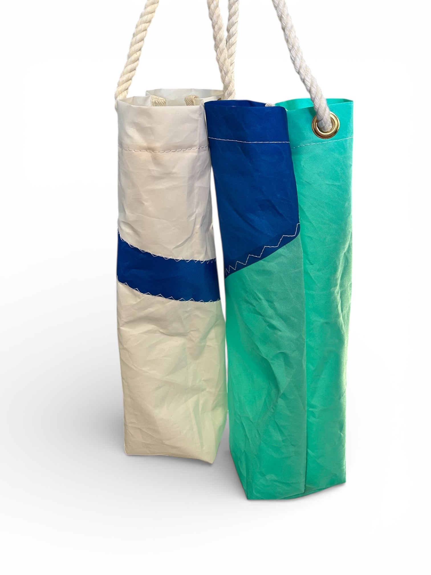Recycled from a previously loved Sunfish sail, this wine bag adds to your hostess gift with a sustainable twist. Offers a sturdy rope handle.Gold-tone grommet for holding weight. Handmade.