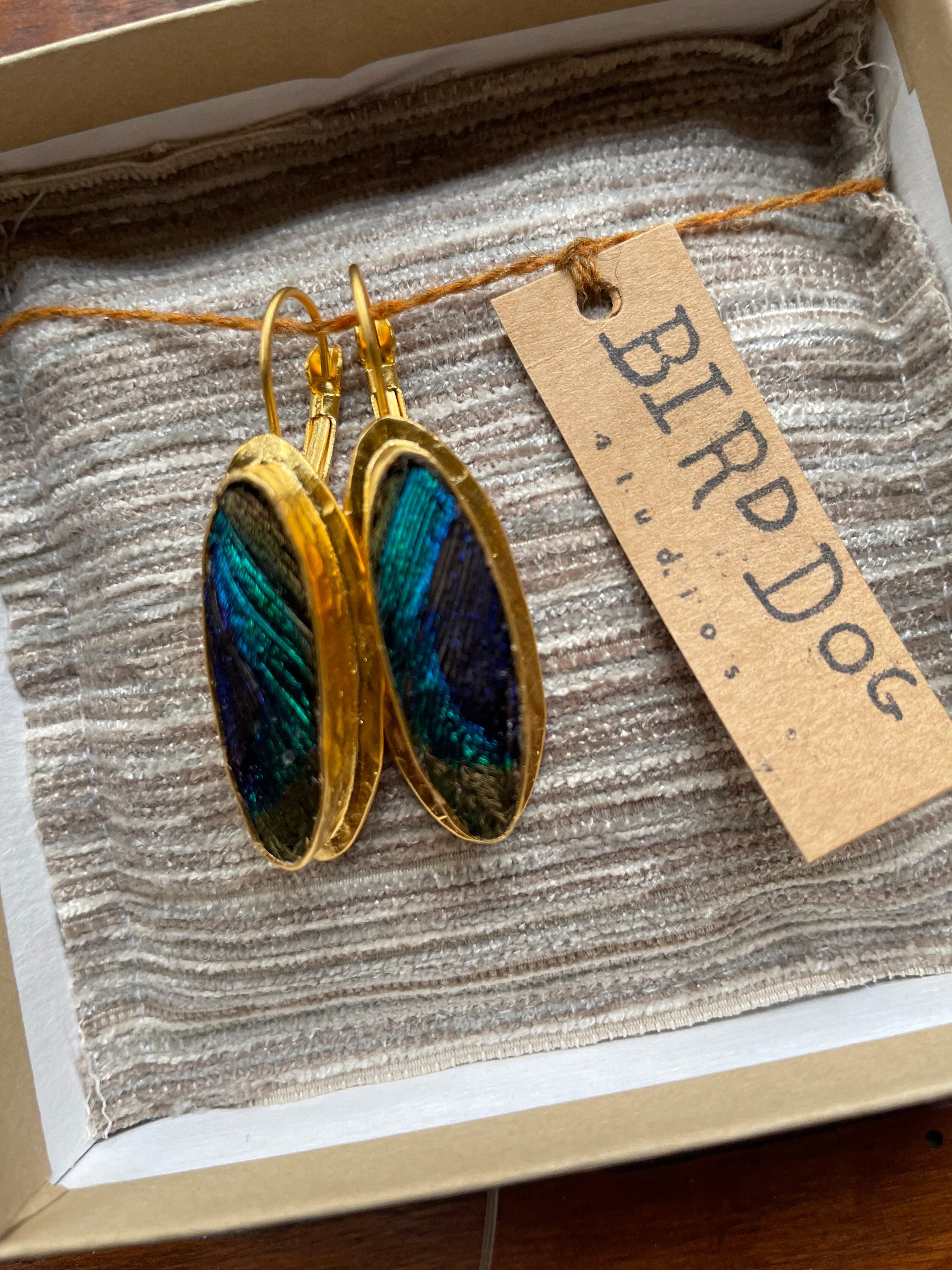 Gold tone and plated ovals filled with brilliant peacock feathers.