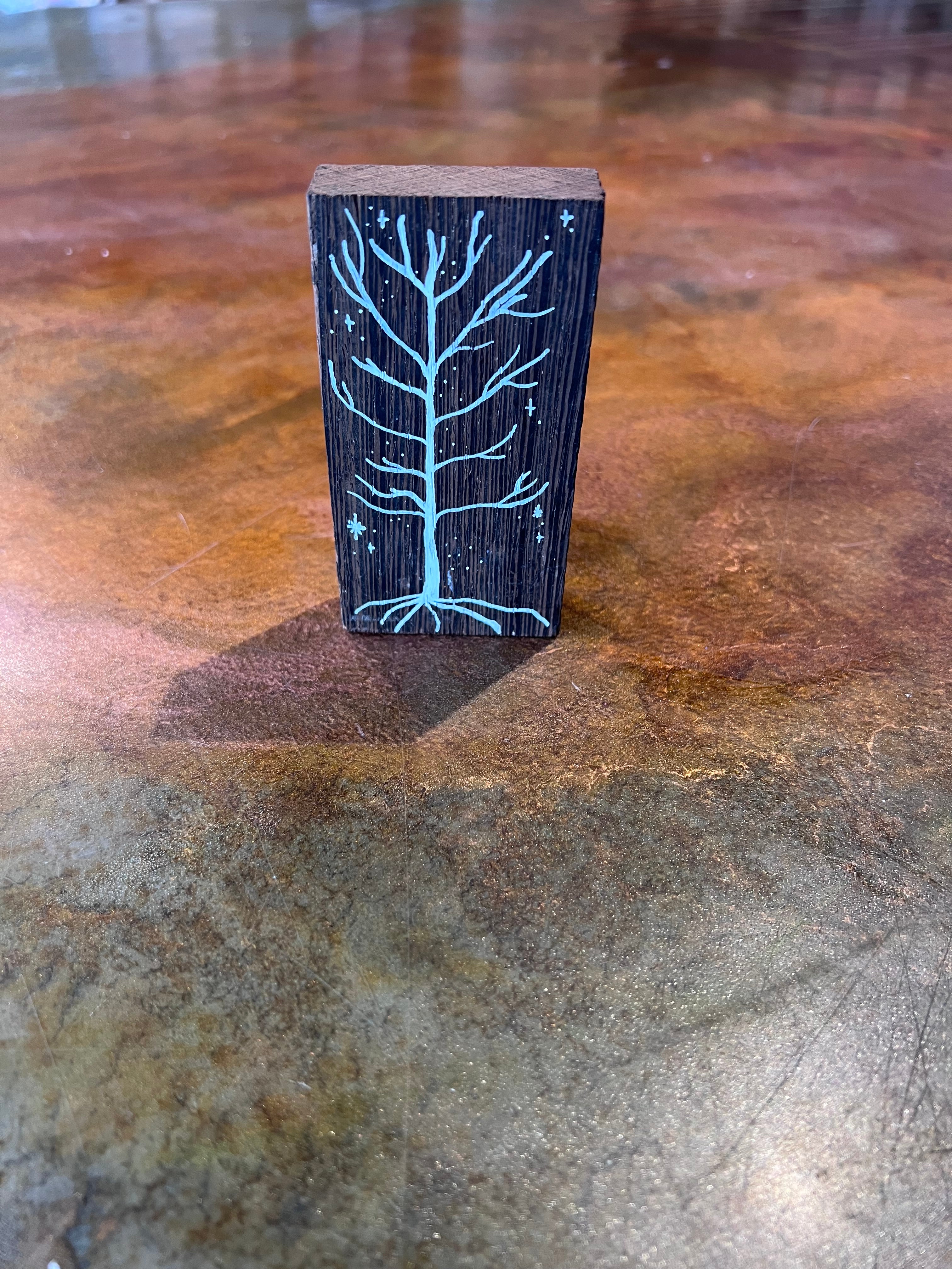 Sparkling tree on a dark wood block base.