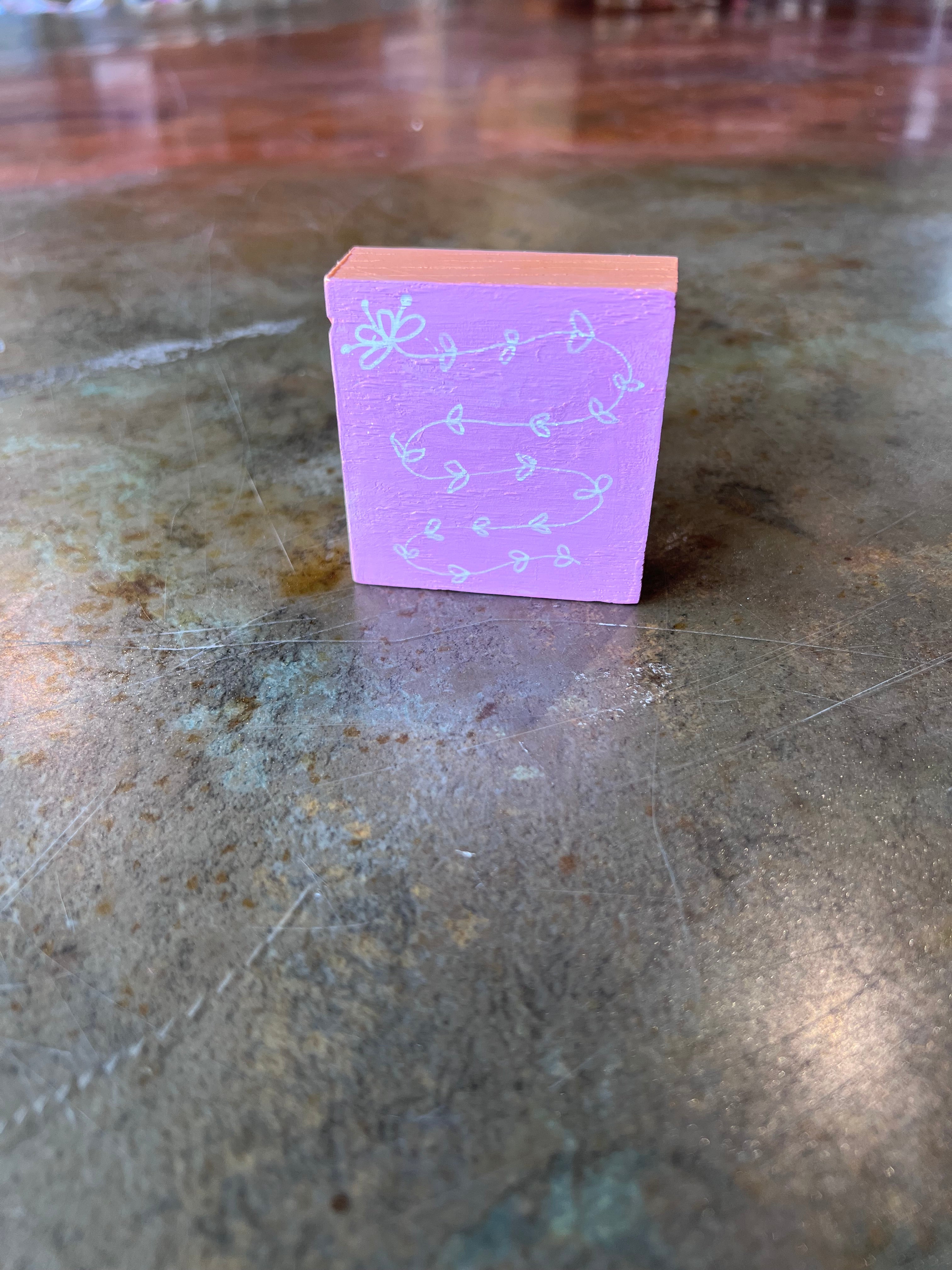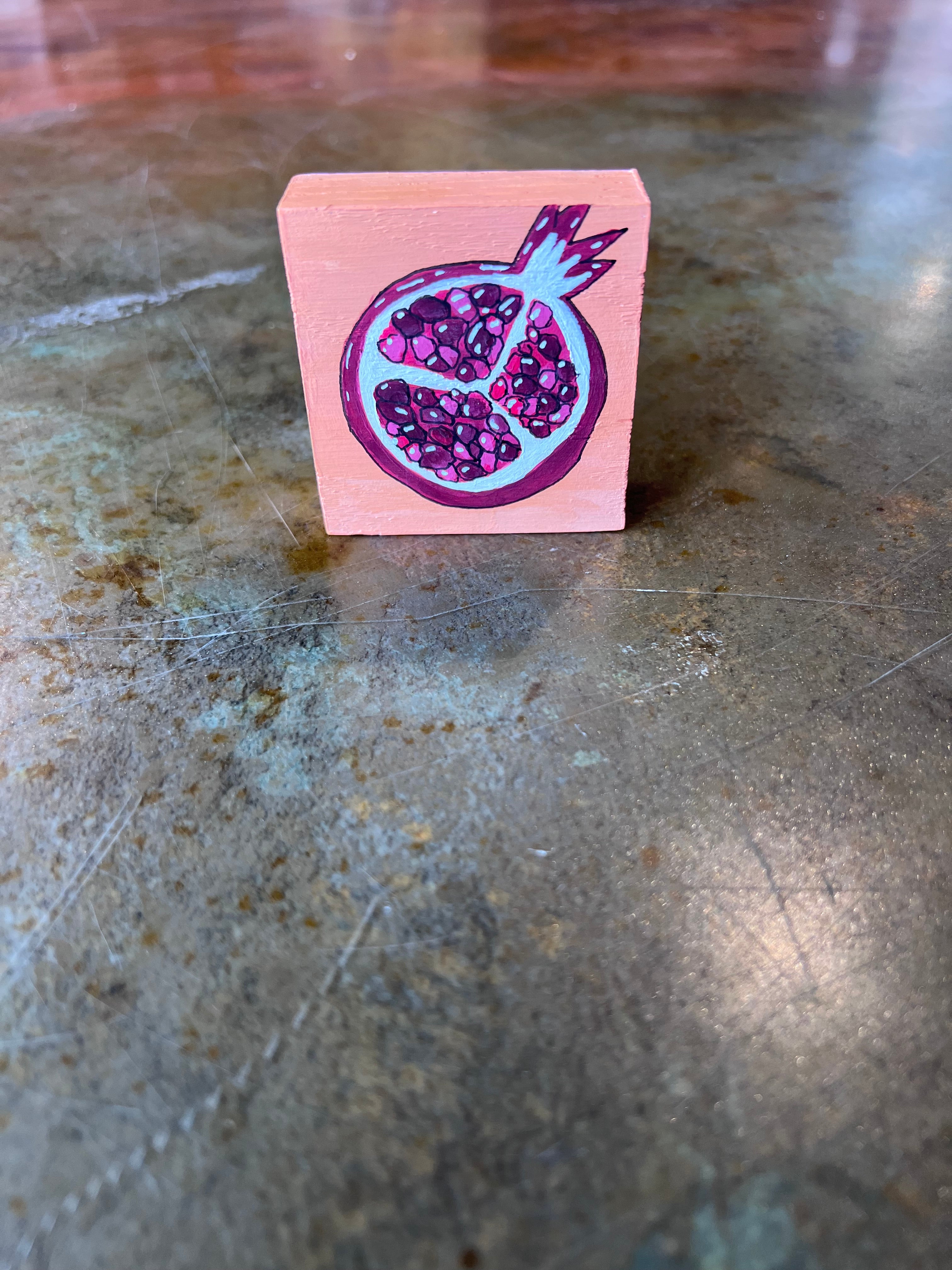An approximately 2.5" x 2.5" small pomegranate painting with bright sunny colors to brighten your mood!