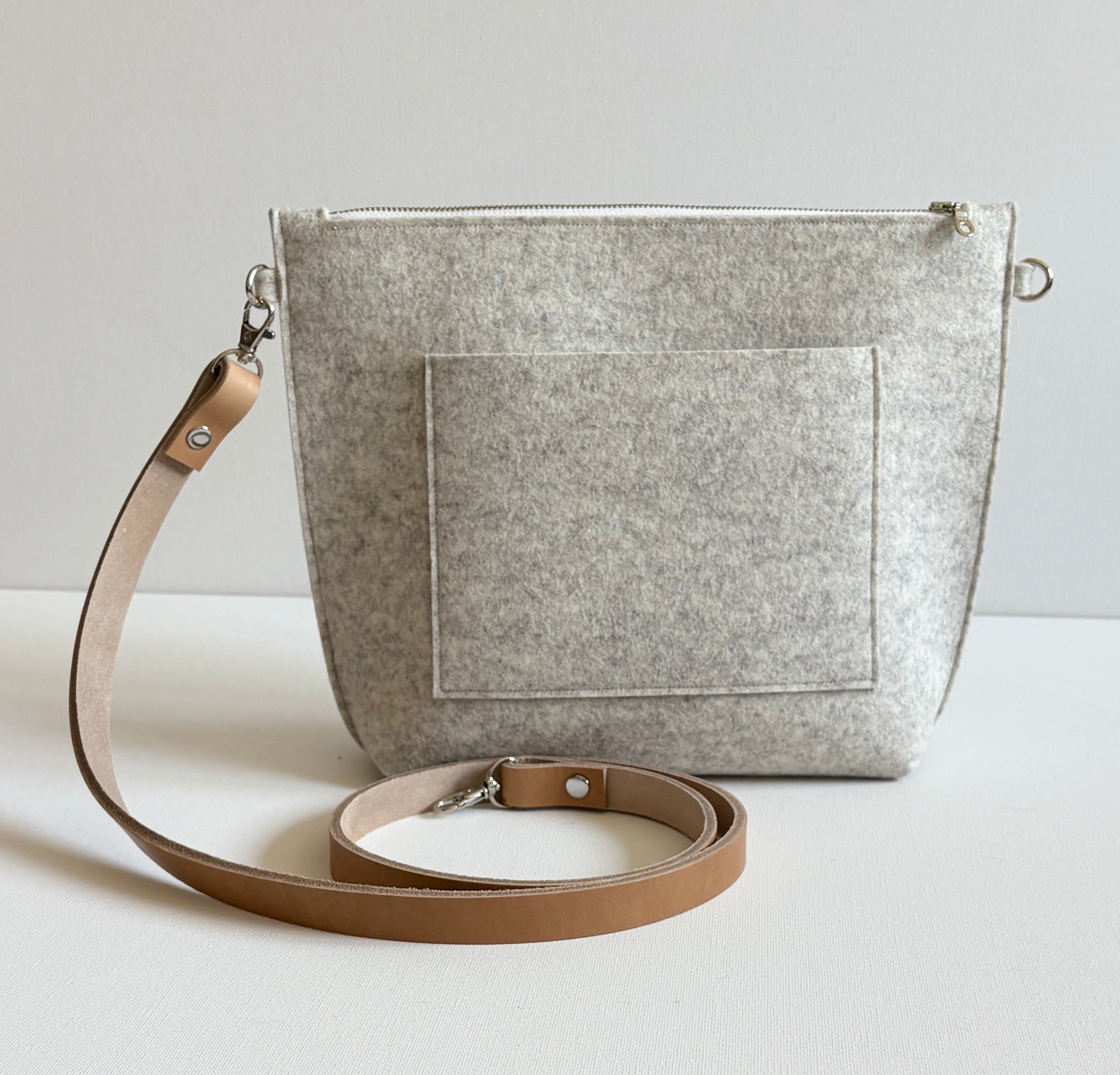 Zara Zippered Tote--Heather Oatmeal Wool Felt Leather Strap Nickel Hardware Size: 10" High, 13" Wide, 3" Deep