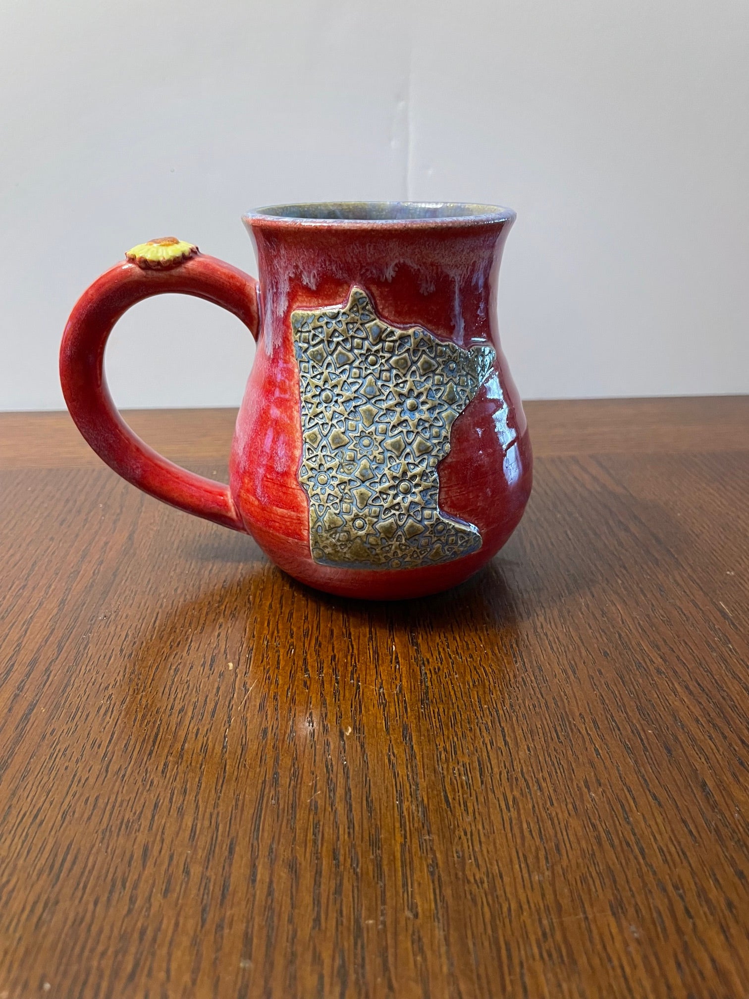 Magenta mug with blue MN decoration. Blue interior.