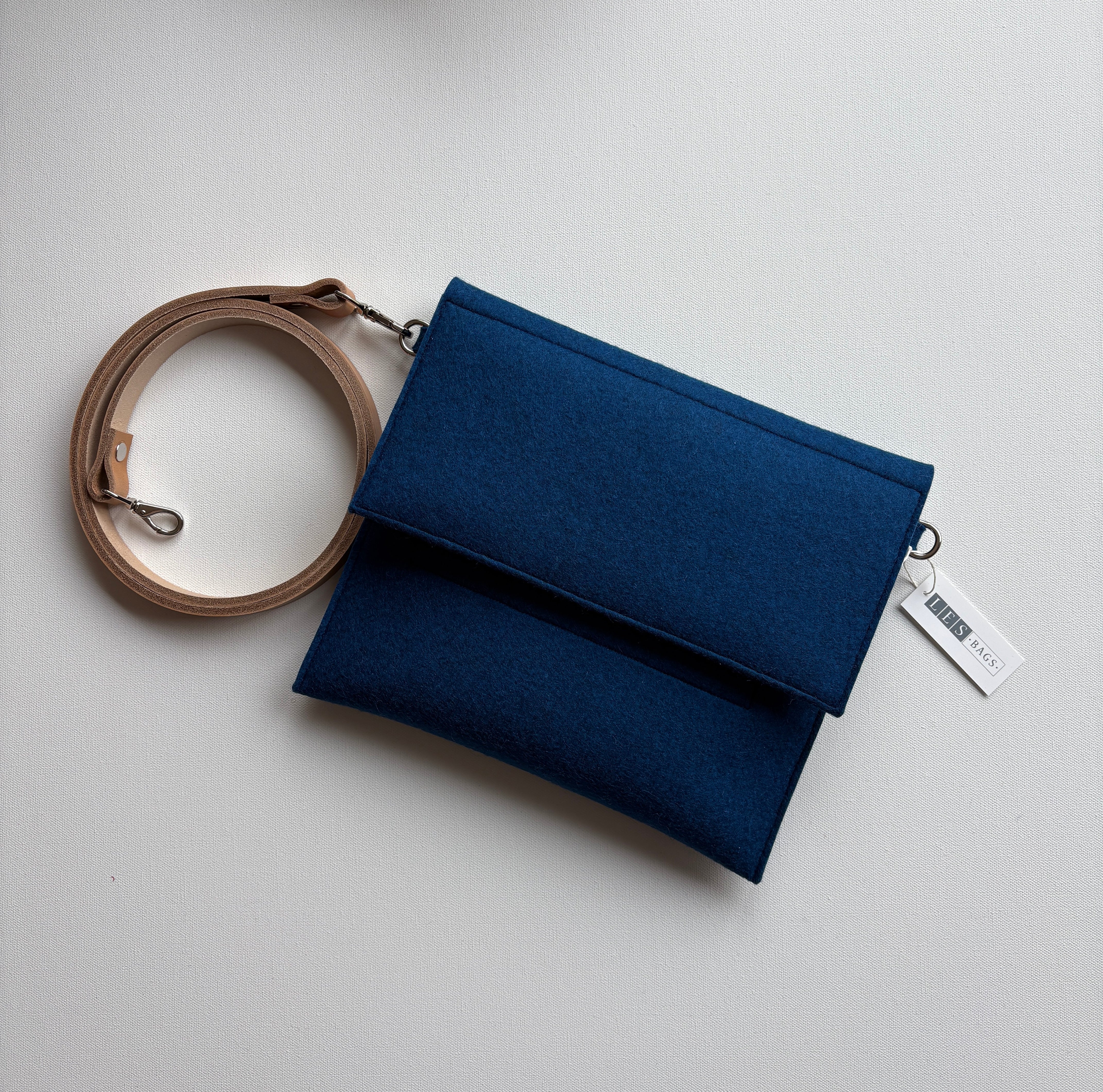 Wool Felt Crossbody Bag with magnetic snap closure and two small inside pockets. Size: 9.5" High, 11" Wide. Color: Ocean Blue