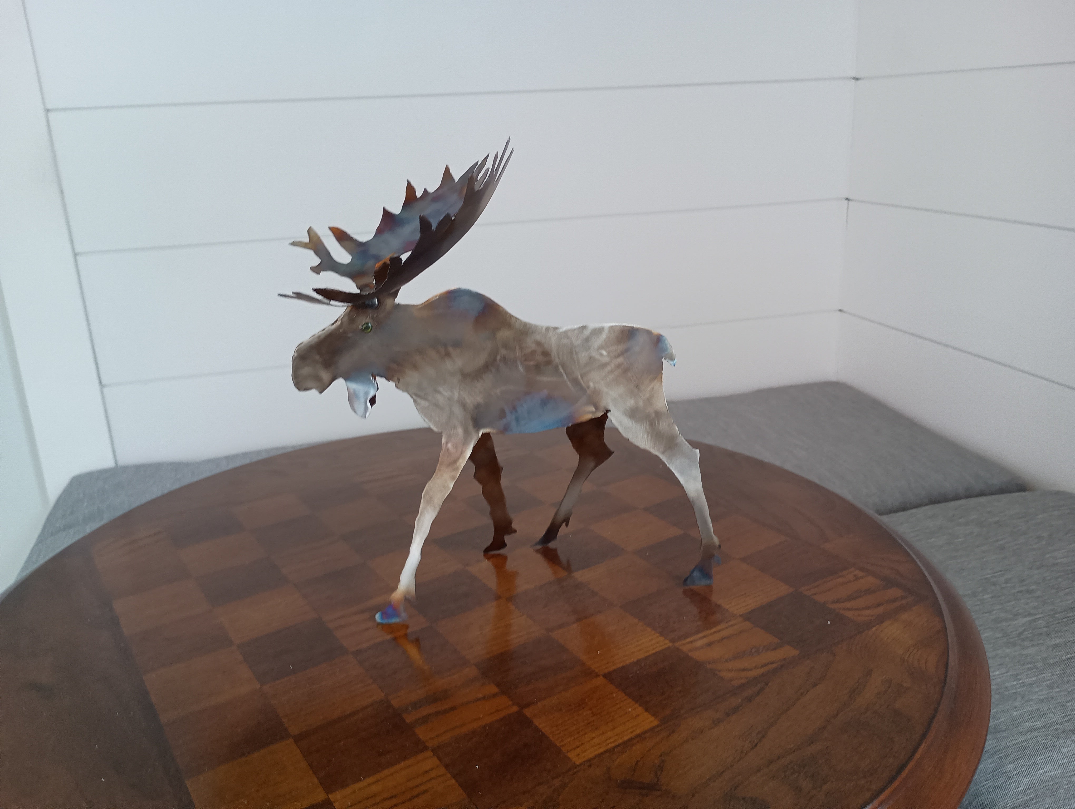 This beautiful Moose sculpture is hand crafted from salvaged stainless steel and finished naturally using heat from a torch. measurements 10 inches long x 10 inches tall