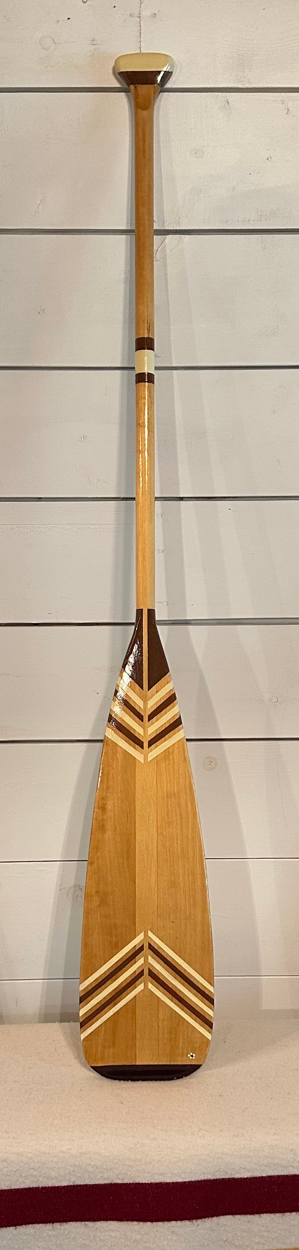 54 inch light wood paddle in excellent condition. Painted in nutmeg and vanilla, brings warmth to this piece. This paddle was sourced in Hudson WI. There is a cool logo on the back of the paddle, confirming its origin. A beautiful one of a kind conversation starter for your home!
