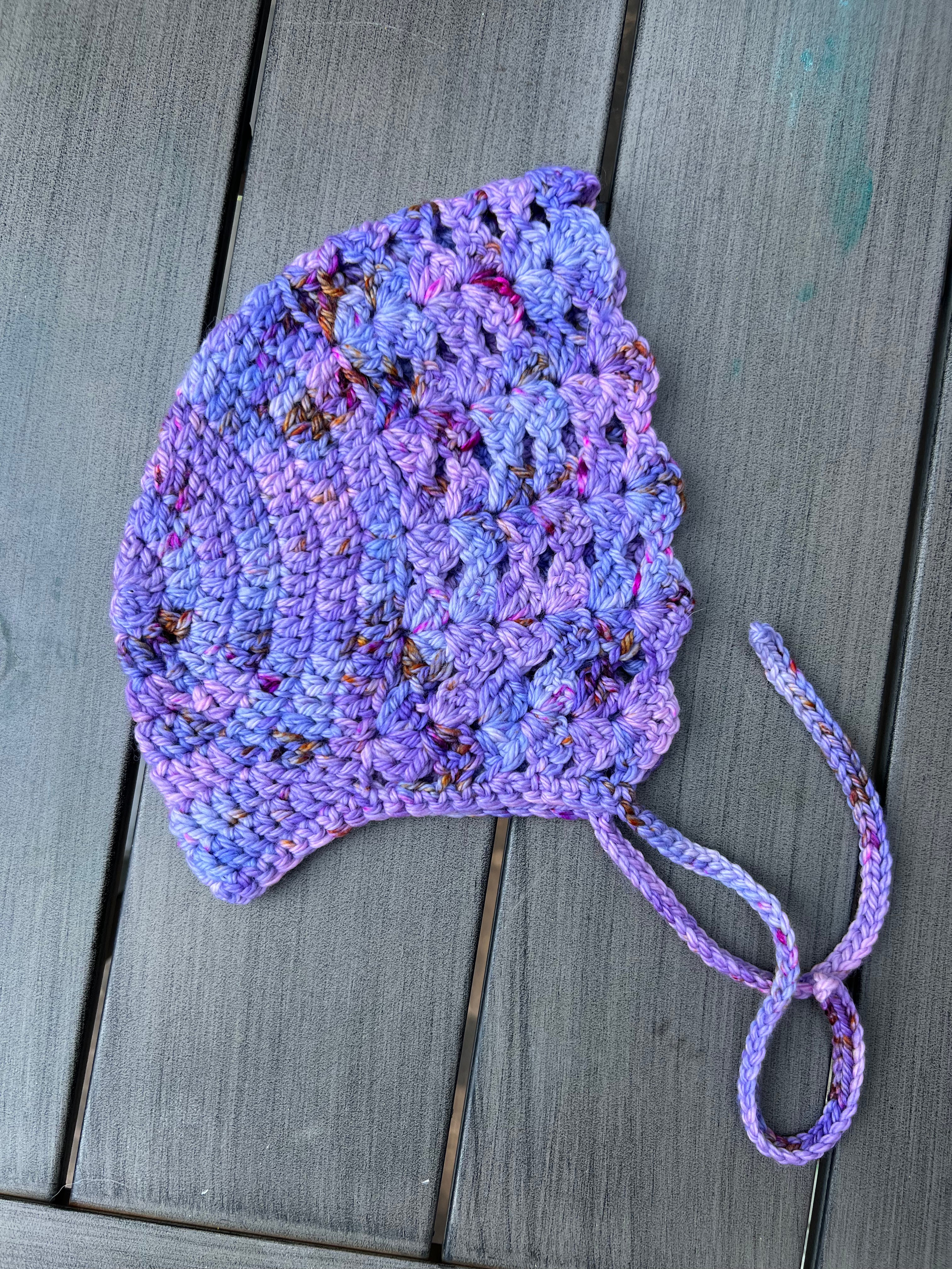 Baby bonnet crocheted with 100% Merino wool in the color "Peanut Butter & Jelly" Size: 8-12+ months. Pattern Credit: Frisian Knitting