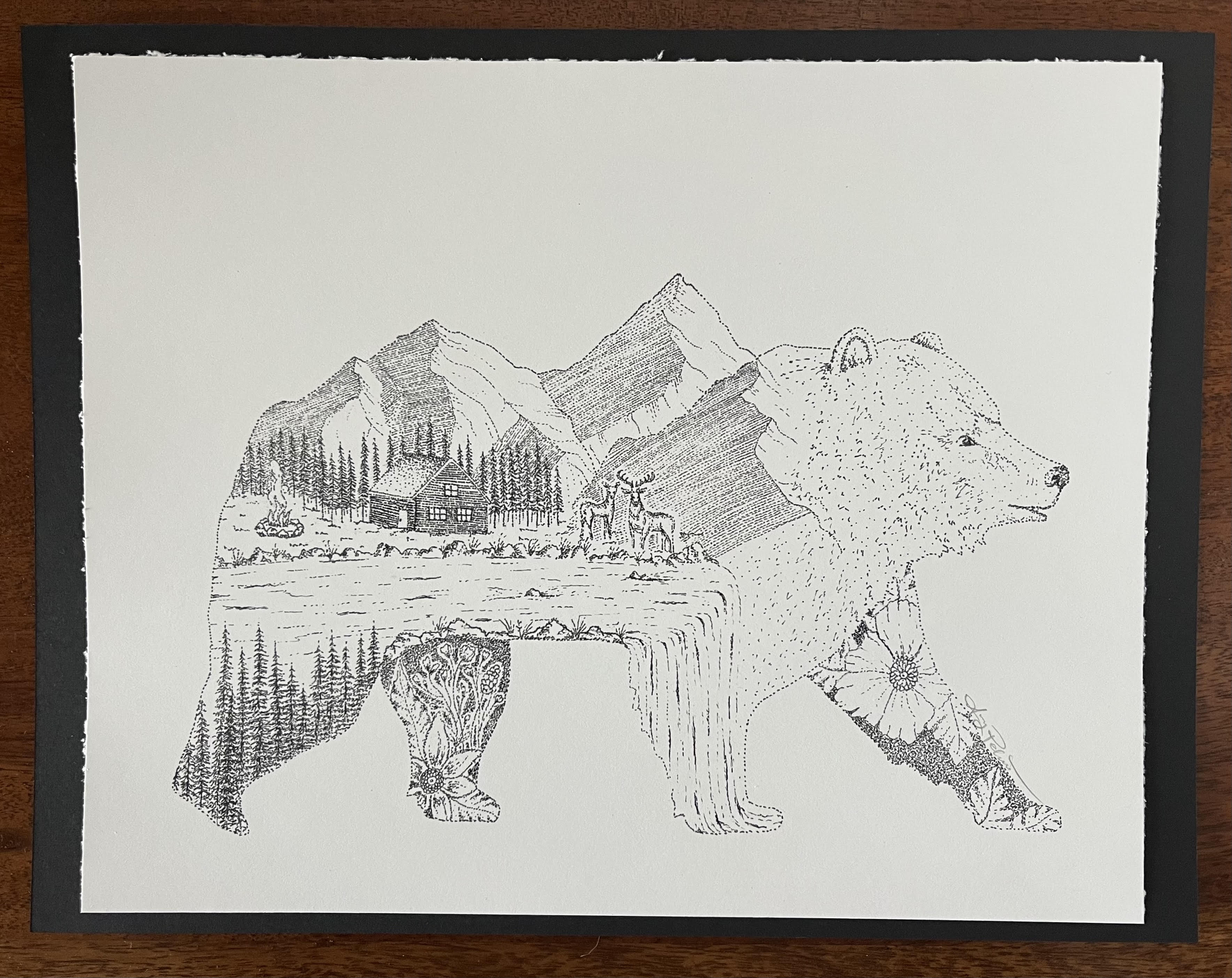 An 8x10 print of the original illustration of a Brown bear with a mountain, cabin scene inside.