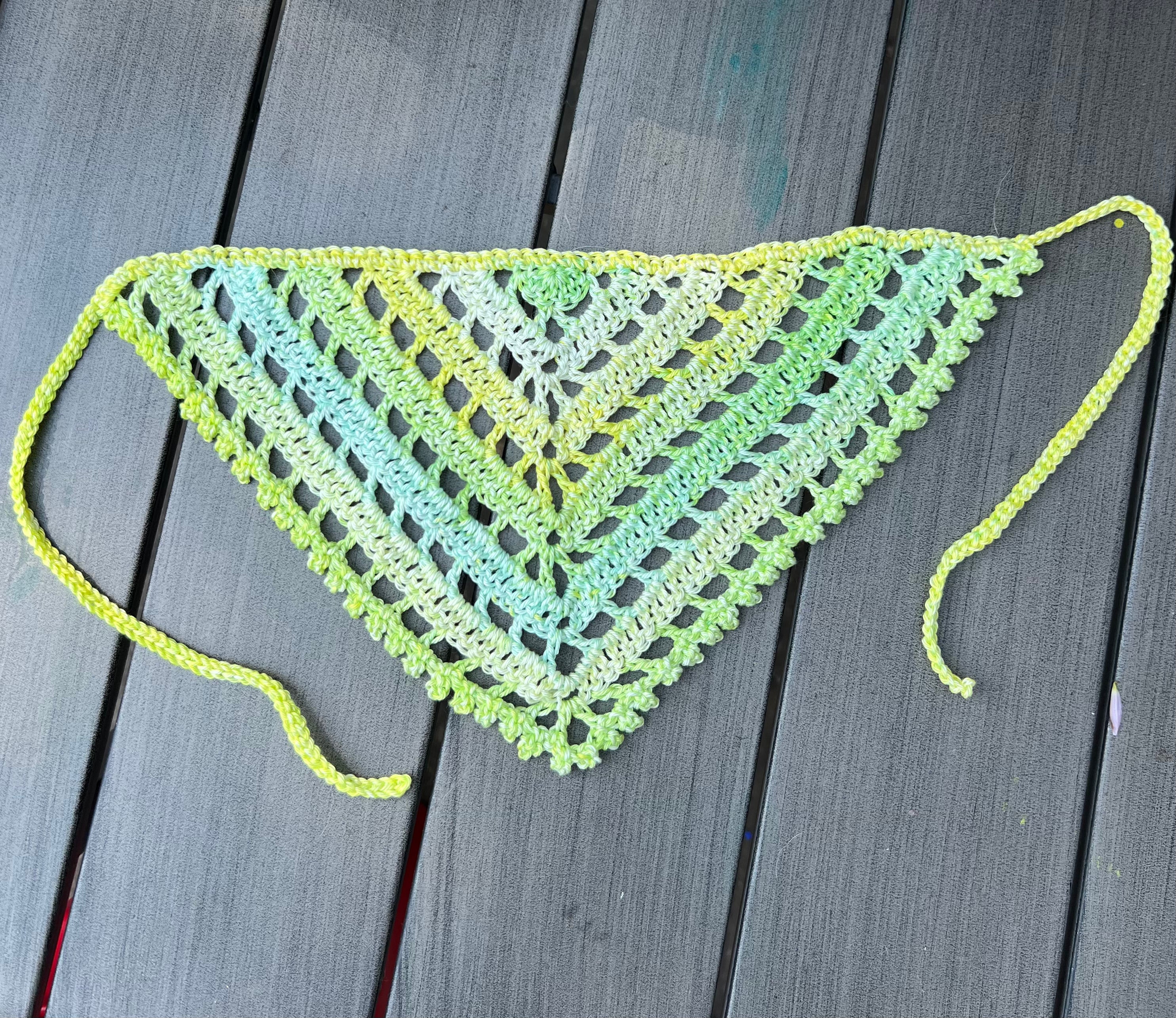 Adult S/M size bandana crocheted with quality mercerized cotton in the color "Romaine." Pattern credit: TorreyaTreasures