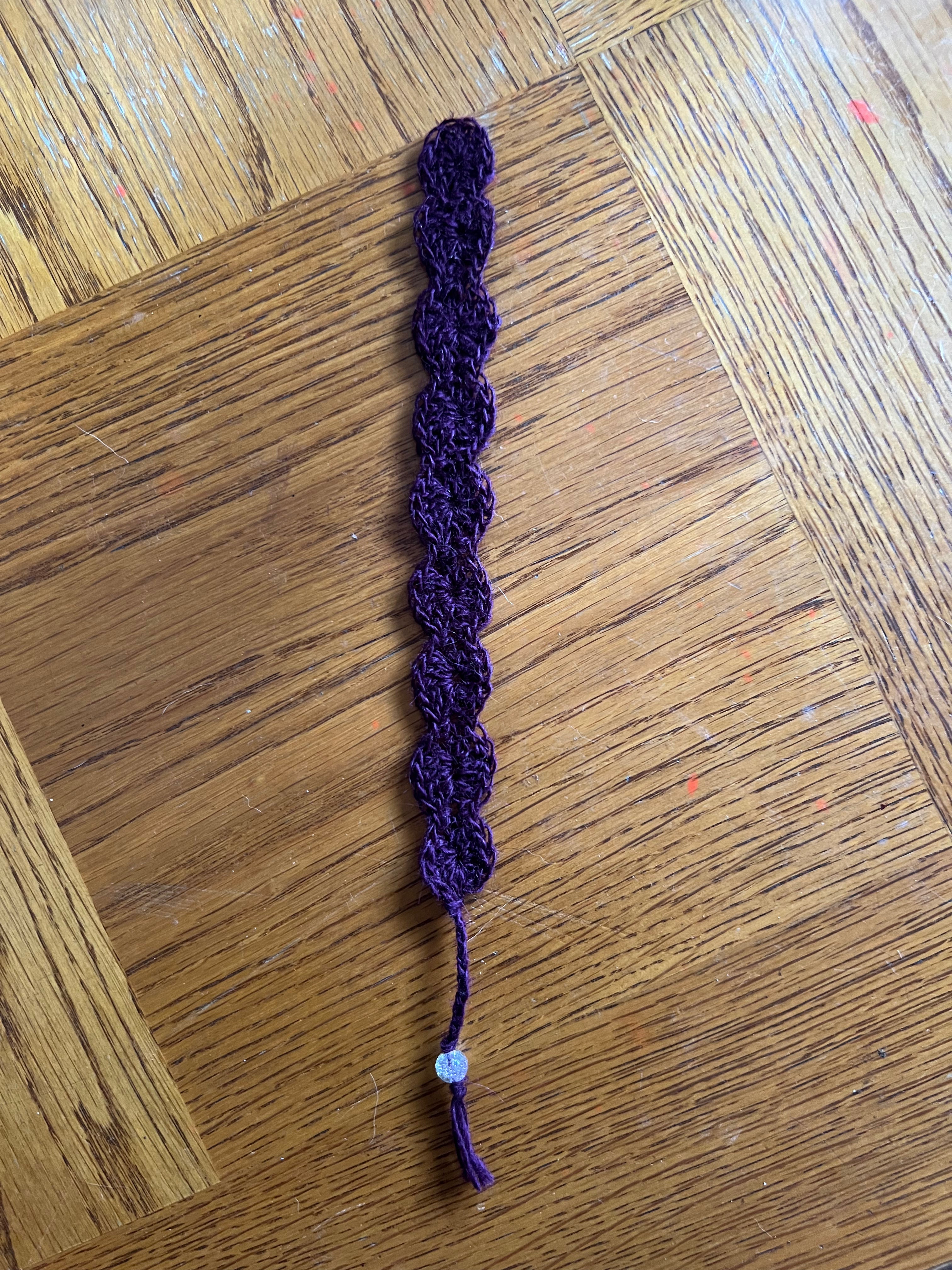 Dainty bookmark crocheted with lace weight Icelandic wool in the color "Eggplant." Pattern credit: Labours of Love Crochet