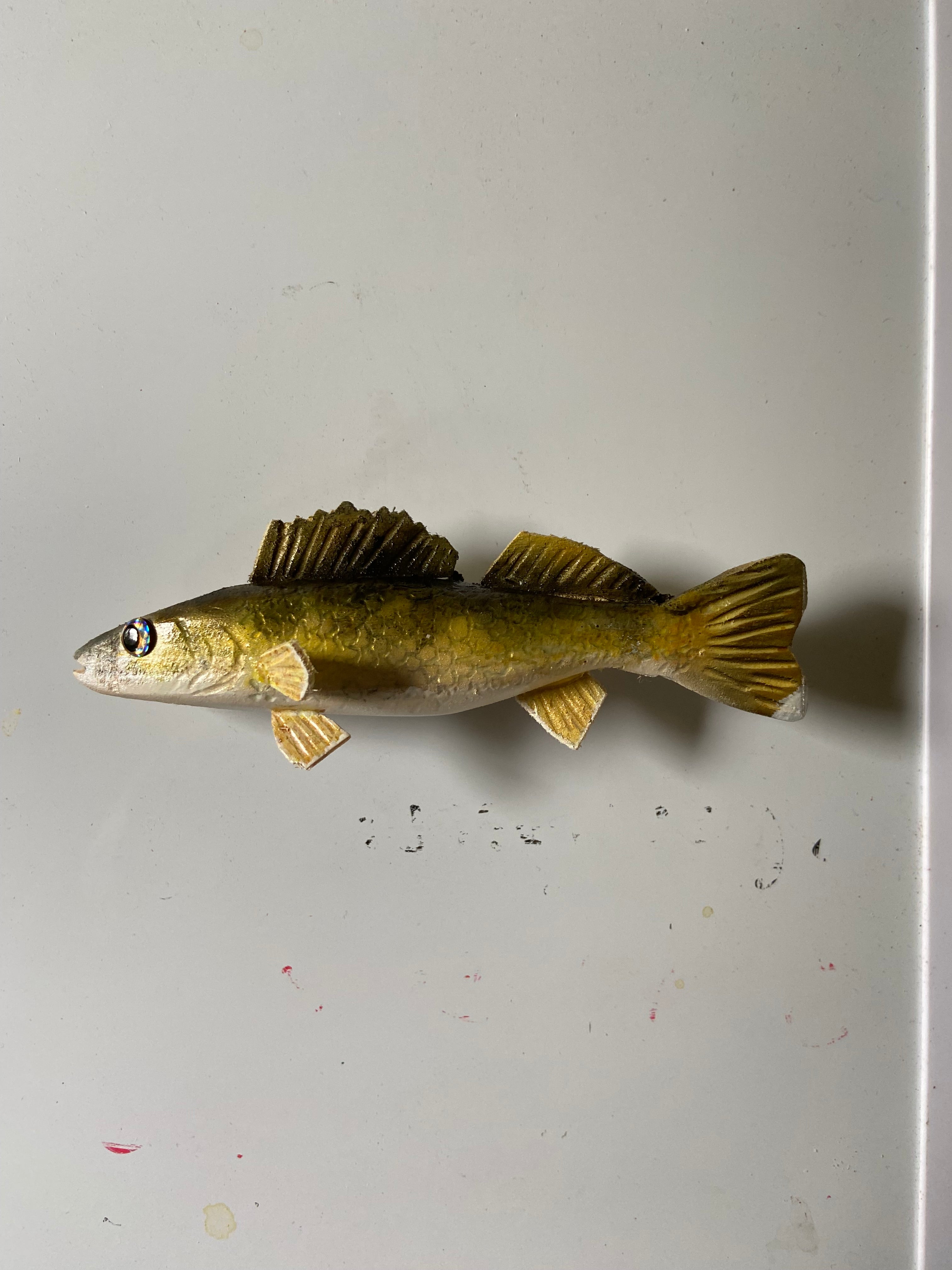 Walleye Magnet – 5-inch. Made and carved from wood with wood burned scales. Attached fins are delicate and are made from 1/32 inch basswood. The watercolor paints are supplied from McKenzie Taxidermy. A polyurethane clear gloss finish gives the fish its wet look.