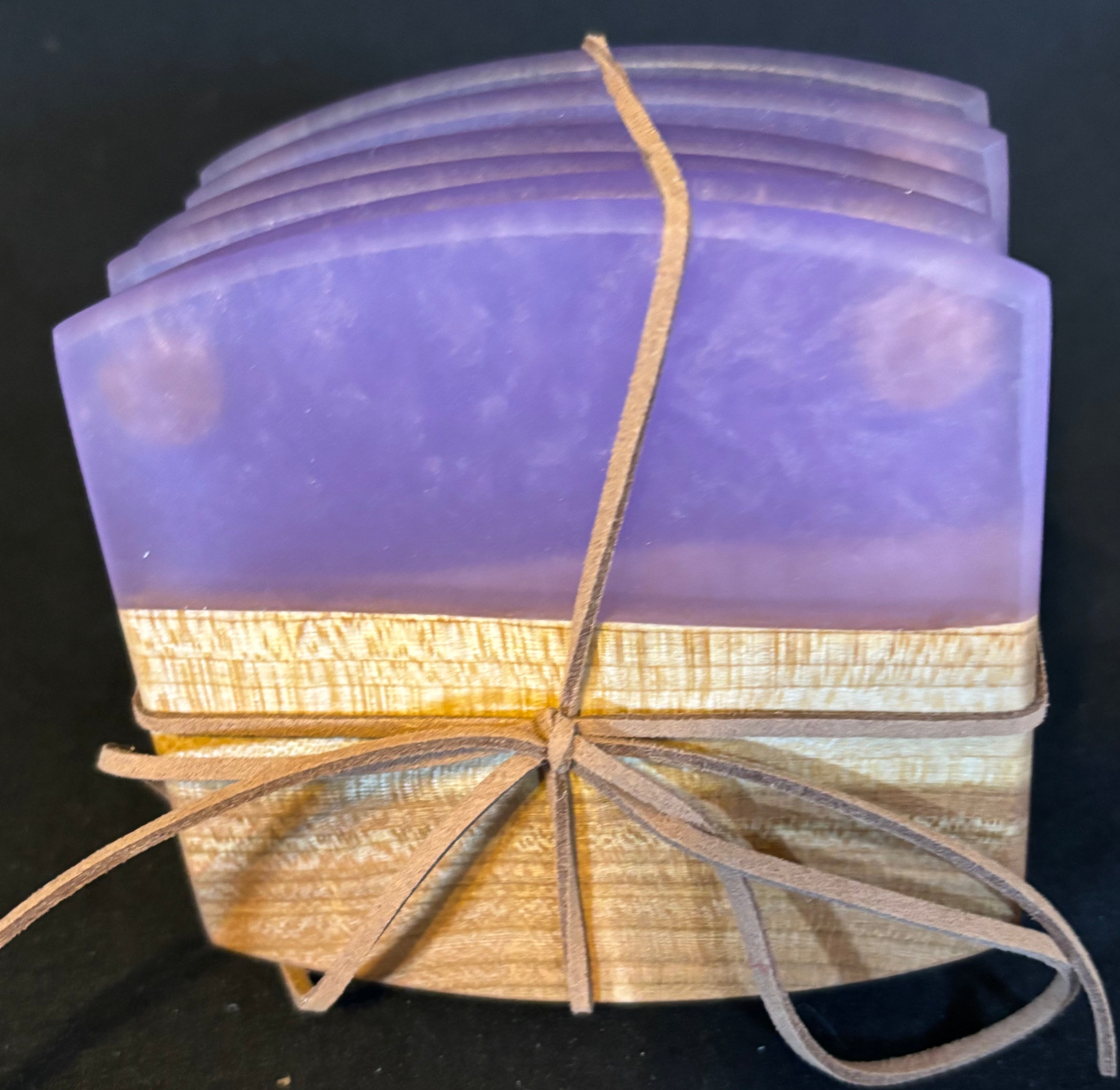 6 piece Coaster Set. Made with Maple wood and purple epoxy accent. Approx 4" x 4" x1/4".