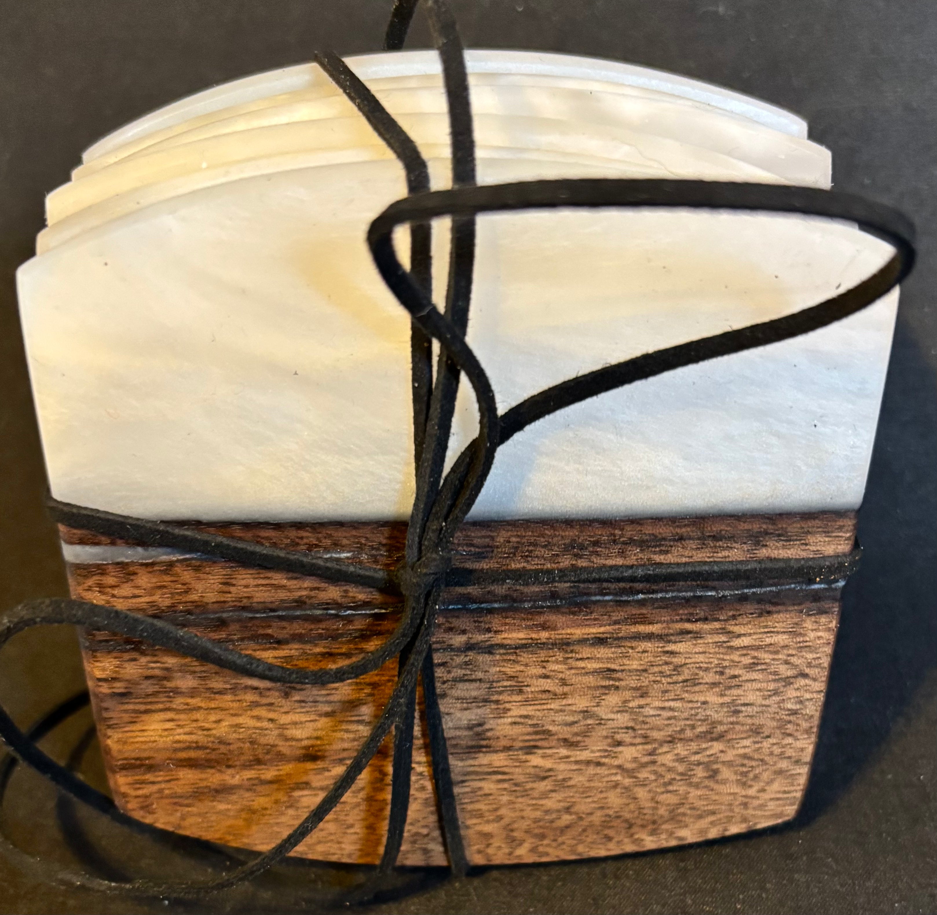 6 piece Coaster Set. Made with Walnut wood and white epoxy accent. Approx 4" x 4" x1/4".