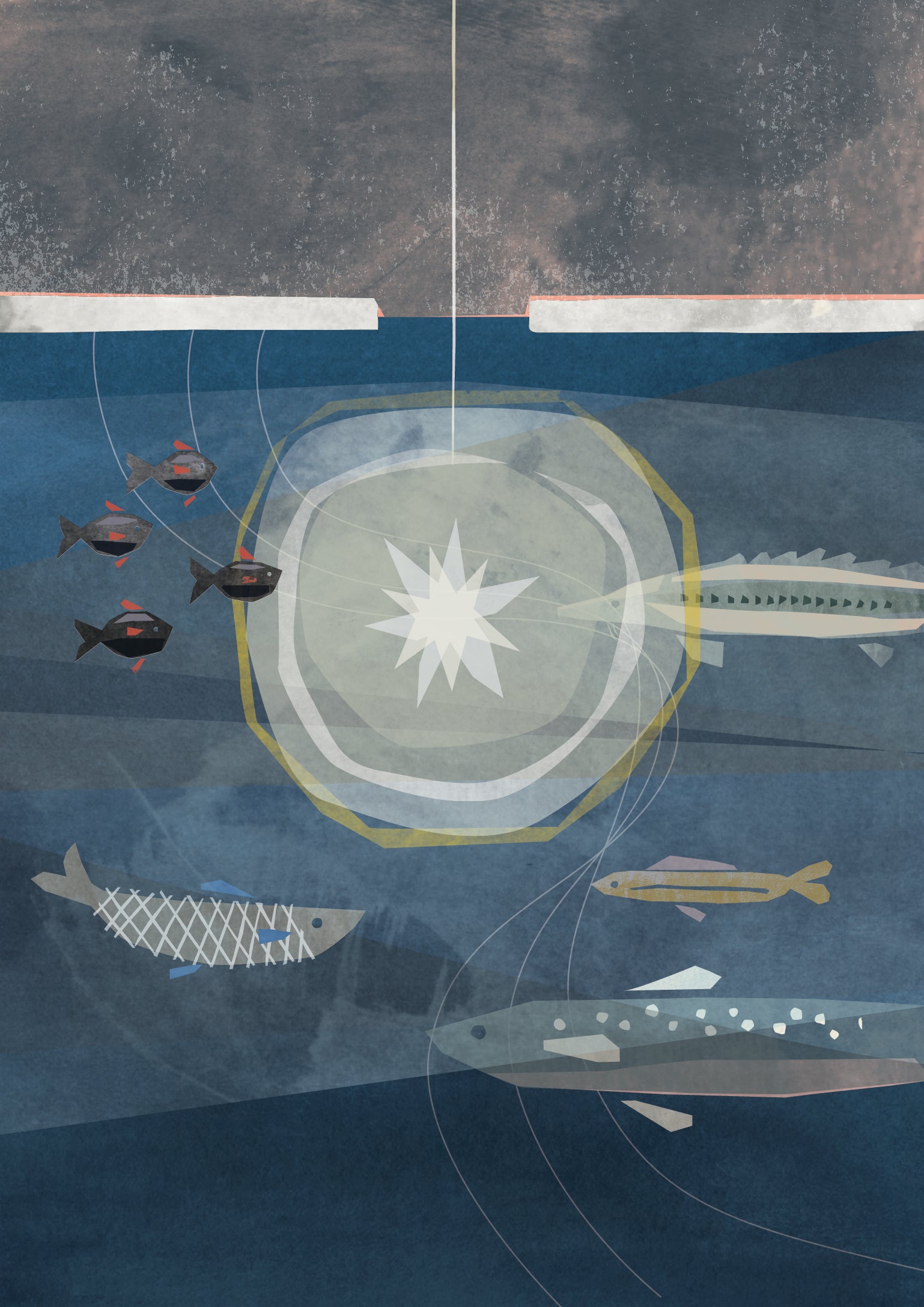 Fish underwater with ice fishing hook shining down a hole in the ice, 8x10