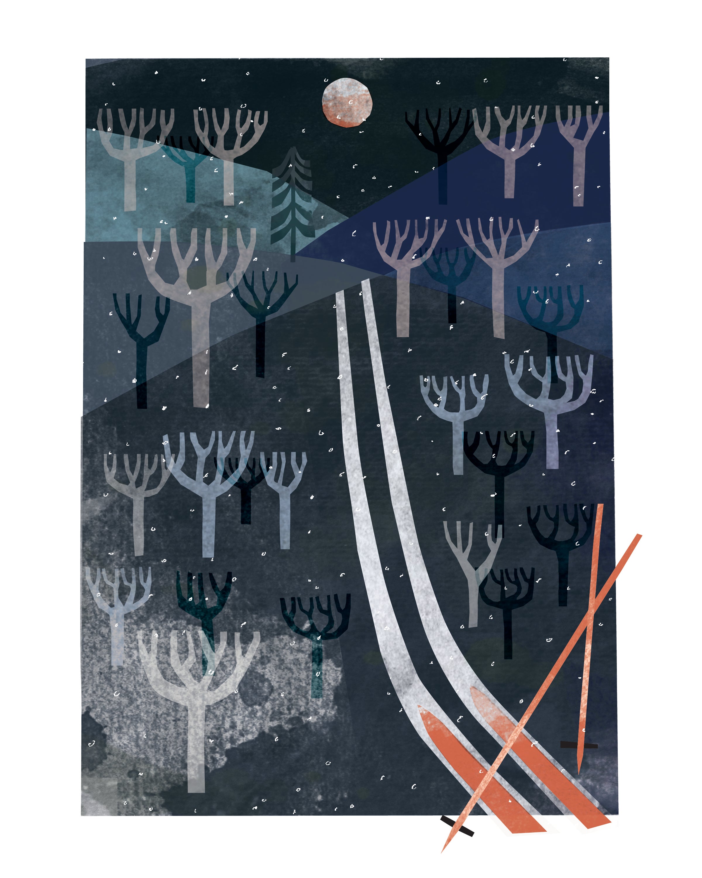 Skis about to go into woods, nighttime, 8x10
