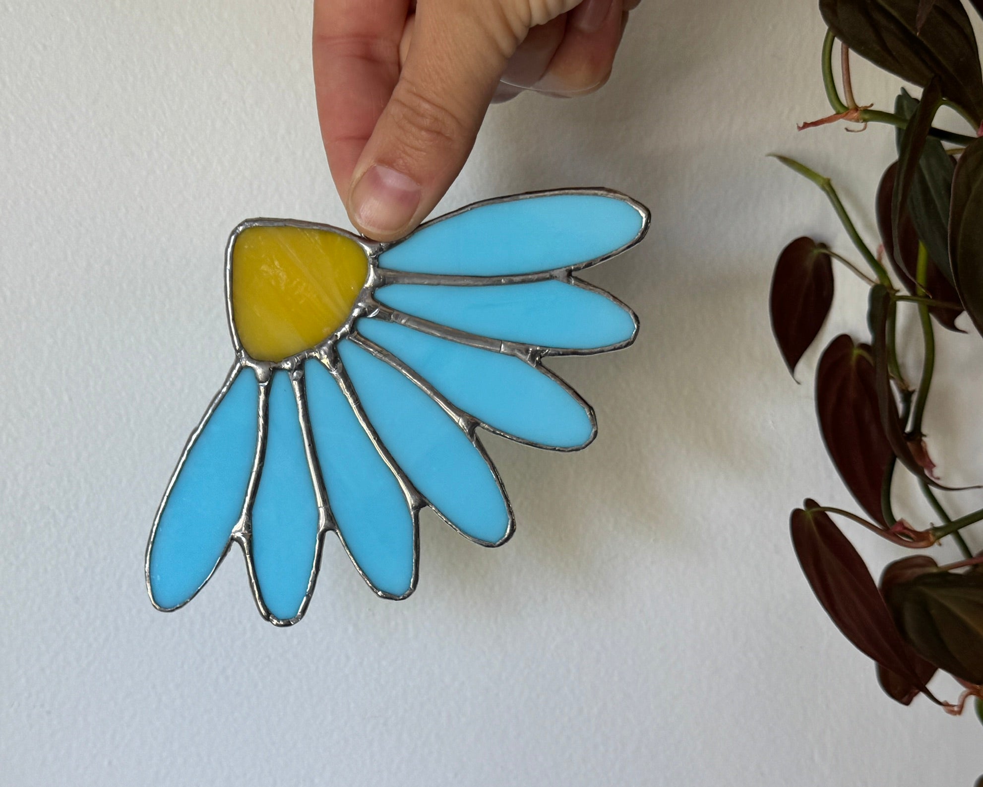 Opaque, solid light blue stained glass cone flower suncatcher.