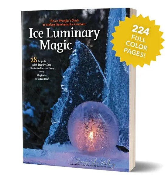 Author Reflections: Ever since I successfully created my first sheet of Ice Glass, I became obsessed with experimenting with ice! I fell in love with this artistic medium that is fragile yet strong and sparkling yet dense. In a sense, Ice Luminary Magic is my opus. It is the aggregation of a lifetime of spraying, lugging, coloring, gluing, stretching, wiring and playing with ice.