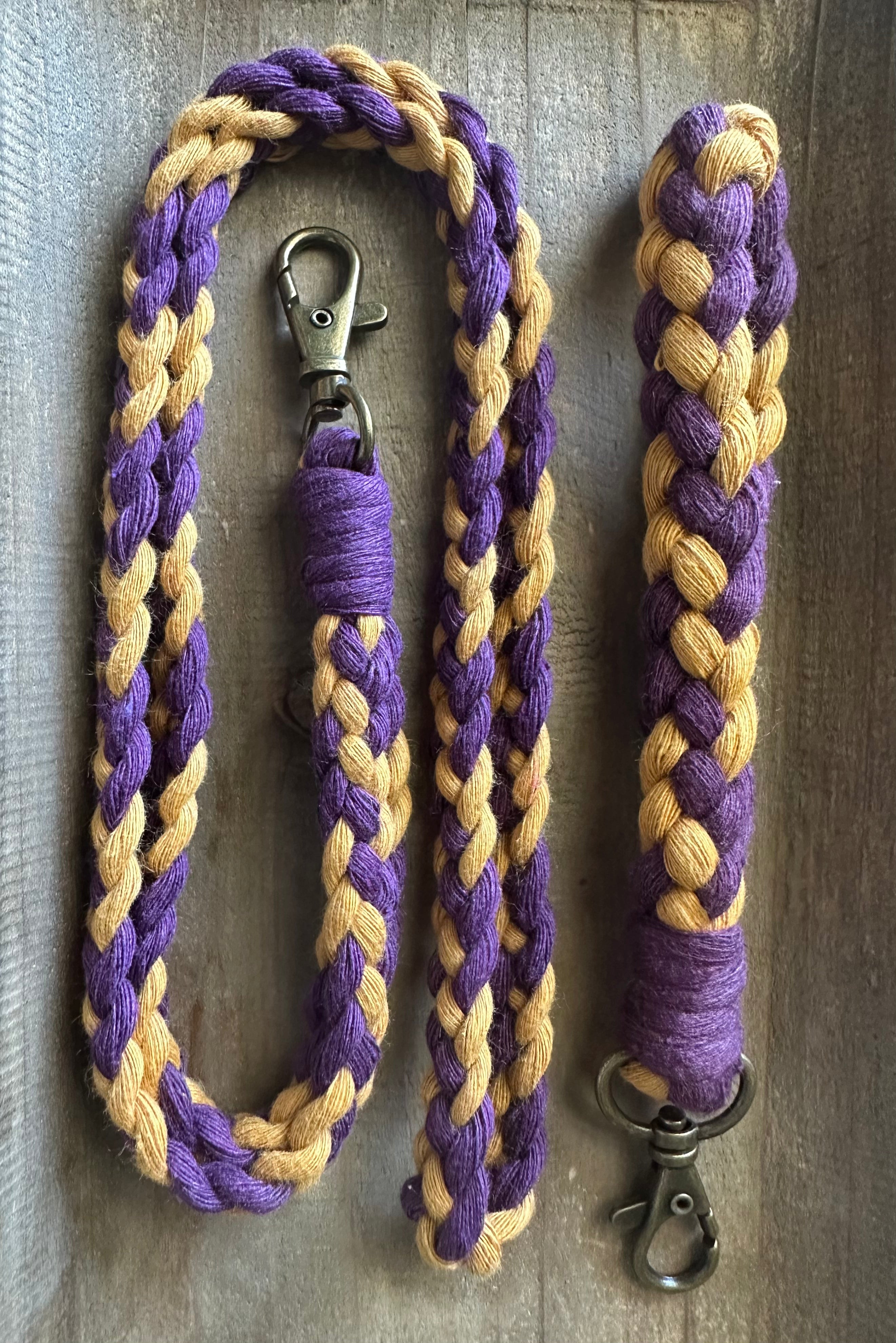 Elevate your everyday with our handmade macrame lanyard - viking style. Thoughtfully crafted from soft, organic cotton cord that’s gentle on sensitive skin and minimizes irritation, even on the back of your neck. Designed with both style and functionality in mind, this lanyard features a sturdy brass clip, making it perfect for securely holding work badges, keys, or small accessories. Available in a wide variety of beautiful colors, you can choose one that suits your style or customize your own unique color combination for a truly personalized touch. Also perfect to show support for your favorite schools and sports teams! Handcrafted with care and intention, this lanyard combines comfort, durability, and elegance into one essential accessory. Whether for work, school, or daily life, this lanyard adds a handcrafted flair to your routine while keeping your essentials close at hand.