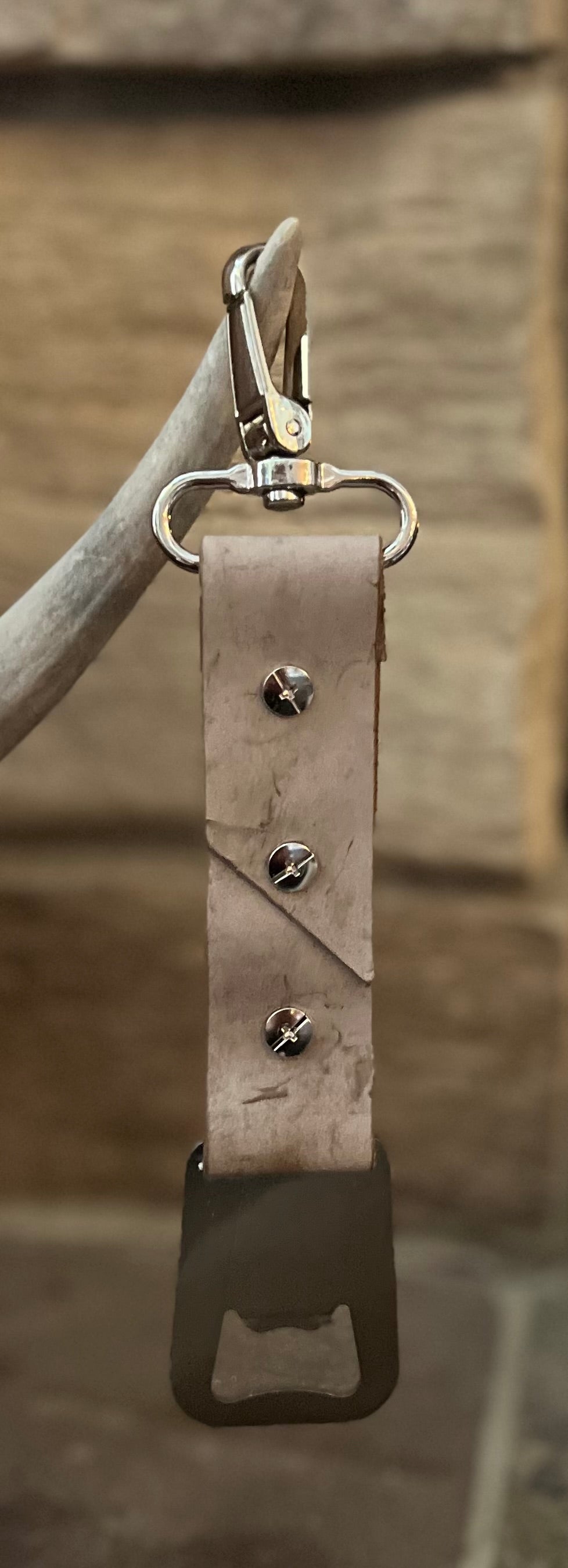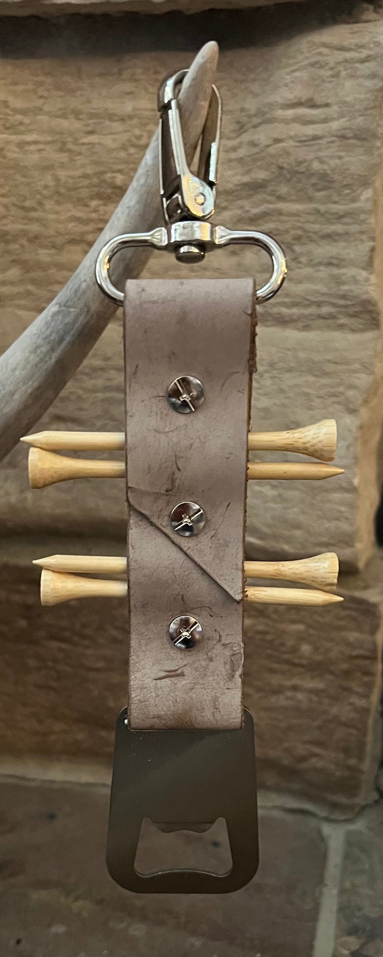 Rustic bottle opener with space to hold your golf tees. The swivel clip bottle opener keychain is the perfect gift for any man in your life. The large swivel clip hooks onto a belt loop, backpack or keychain. Never be found without a bottle opener for your beers again.