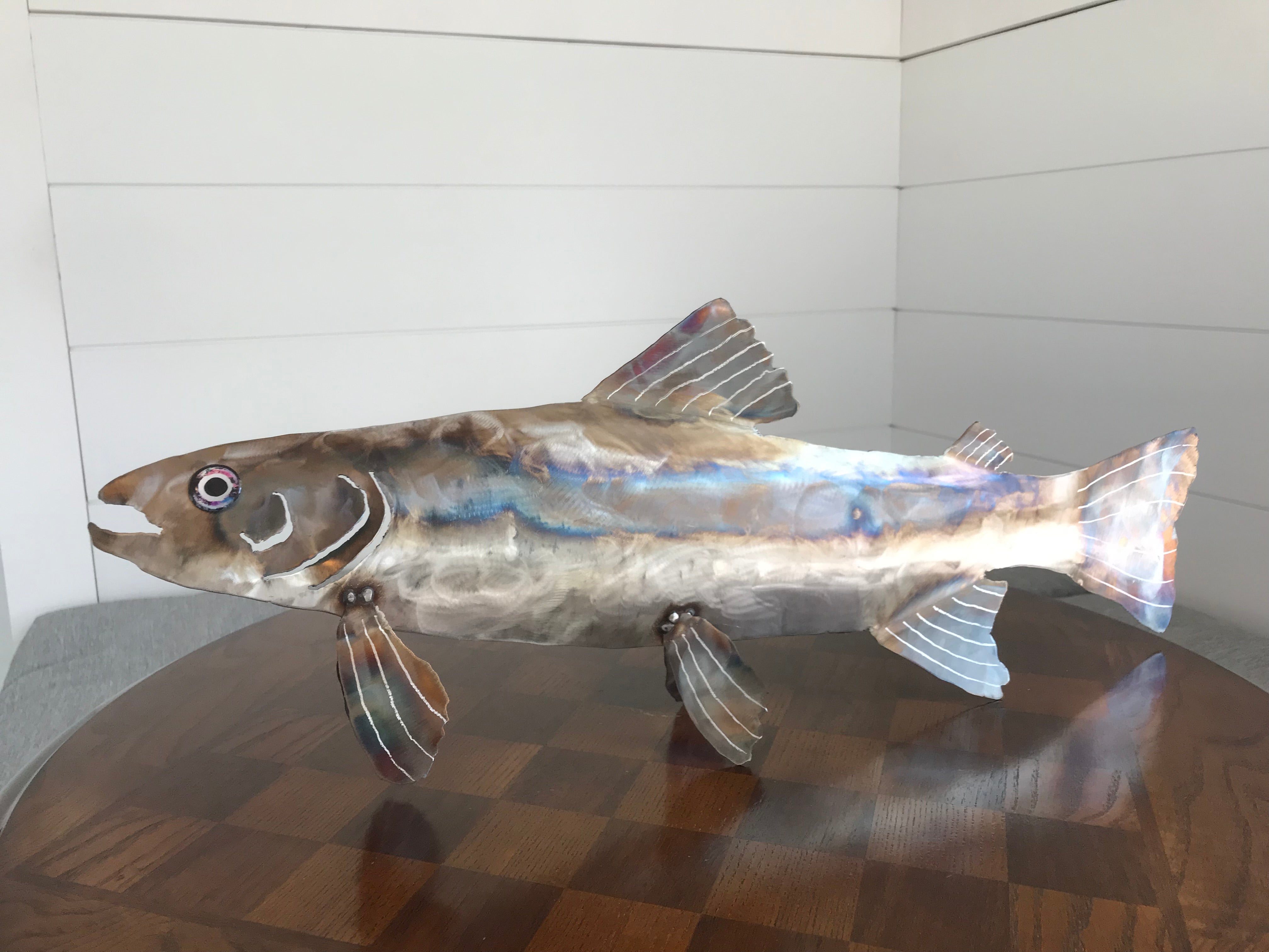 Handcrafted from salvaged stainless steel. Naturally finished using heat from a torch. 21" long x 7" high. Tabletop or wall hung. Rainbow Trout Sculpture
