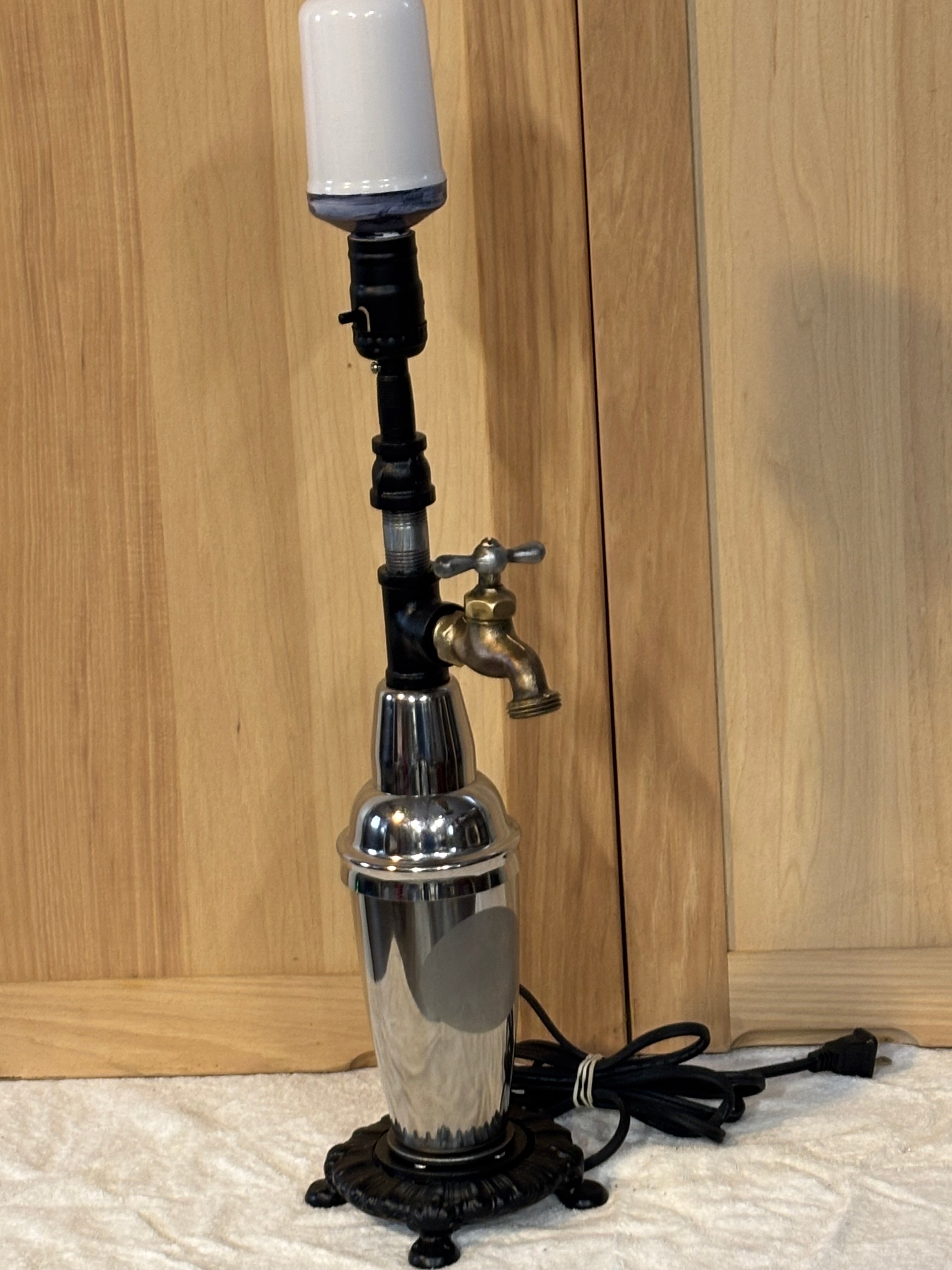 A distinctive steampunk-style lamp, expertly crafted to blend industrial design with vintage charm. This lamp features an ornate black metal stand supporting a martini shaker made of stainless steel. The highlight of this unique piece is a brass faucet handle integrated into the structure, adding a quirky touch. The sleek, cylindrical white lampshade diffuses light evenly, creating a warm and inviting ambiance. Perfect for adding character to any room, this lamp is both a functional lighting solution and a conversation piece.