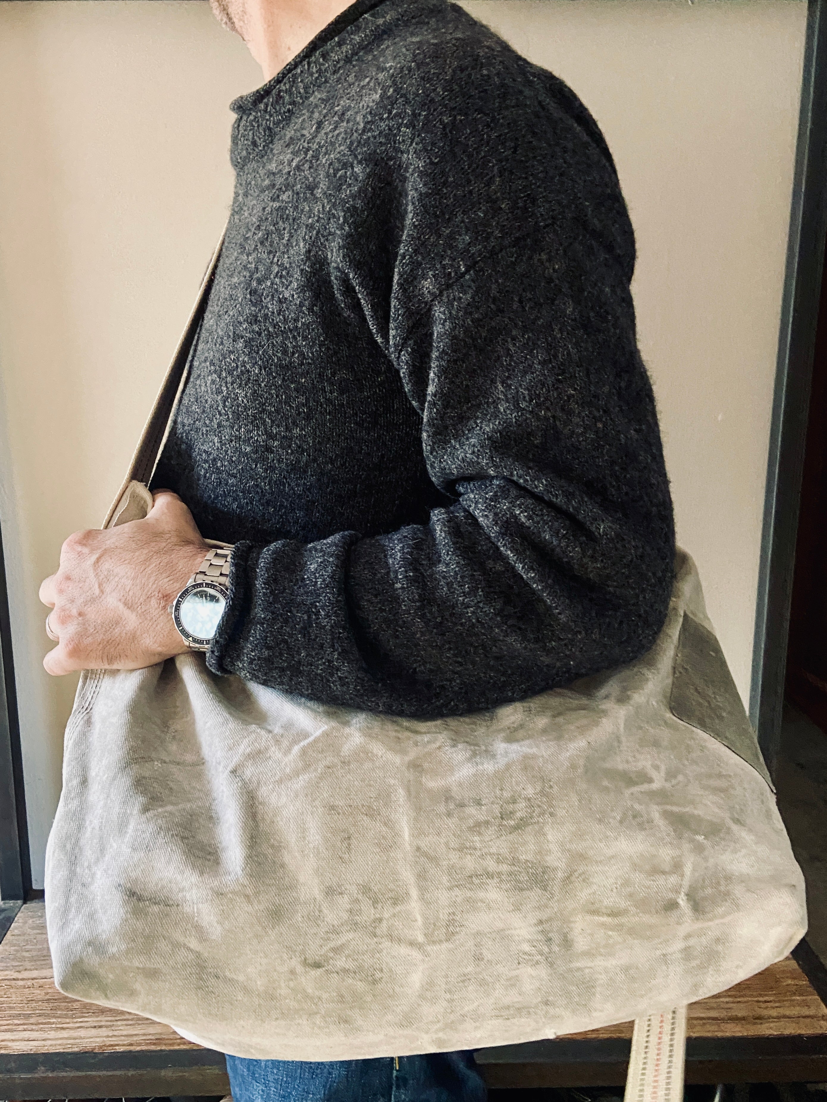 There are lots of battle scars from a life well-lived on this upcycled US mail carrier bag. It measures 22X14X6 inches, has a thrifted adjustable strap, one internal pocket and two snaps for closure.