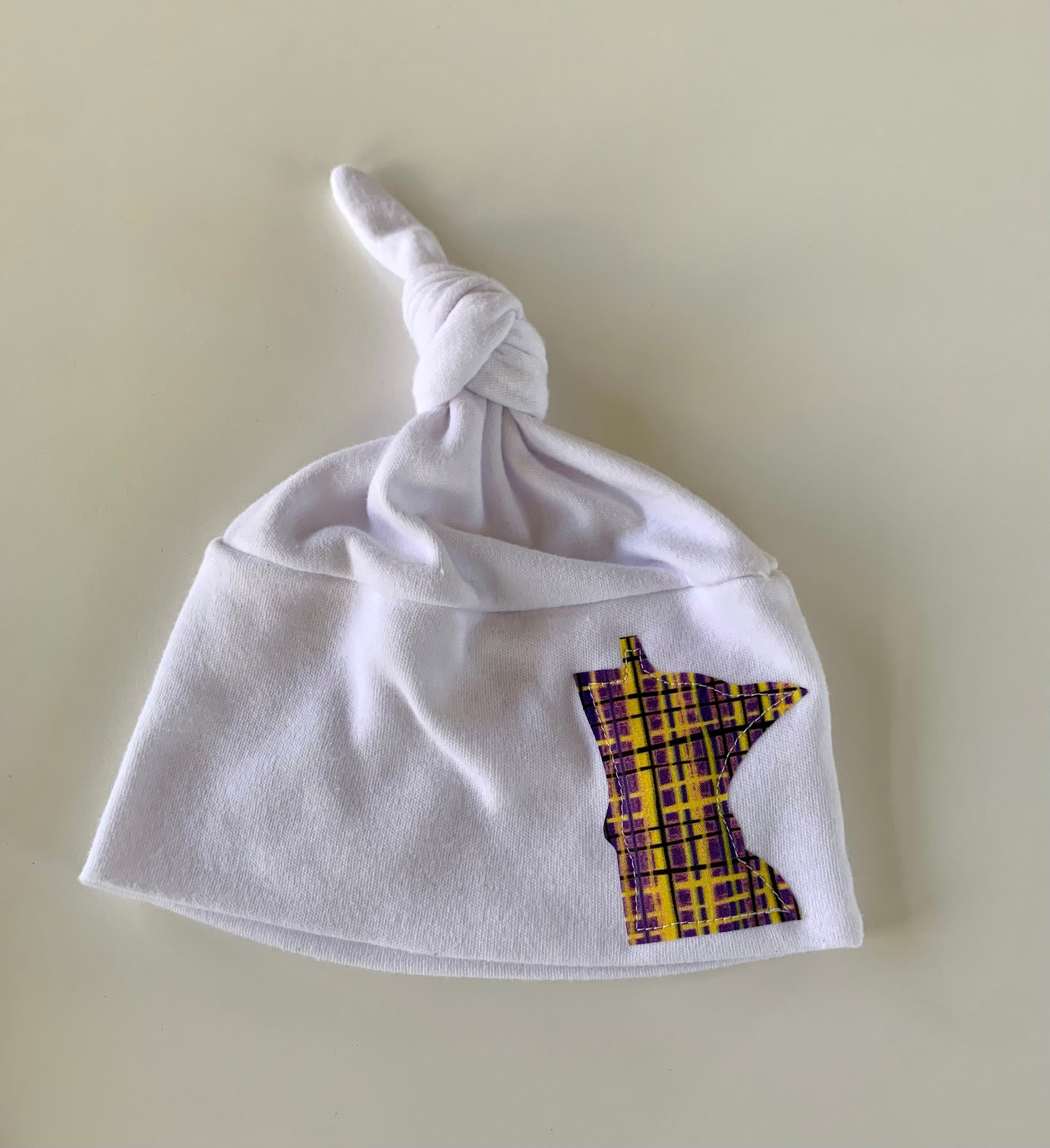 Premium quality soft knotted infant hat with an appliqued Vikings plaid MN. 65% Polyester 35% Cotton interlock knit newborn size.